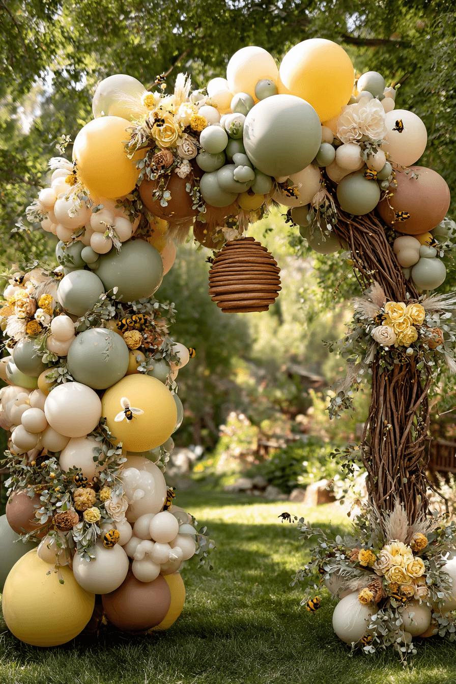 The balloon arch for this Bee Beehive party is unlike anything we've seen for a bee theme — and we mean that in the absolute best way. One side of the arch is built entirely from an organic tangle of twisted branches and twigs, wrapped in eucalyptus and wildflowers to create a living, sculptural column. The other side is a lush balloon cluster in sage green, butter yellow, warm peach, and cream, with clusters of flowers, illustrated bee ornaments, and a hanging beehive lantern centered in the arch opening. It's rustic, whimsical, and completely breathtaking.