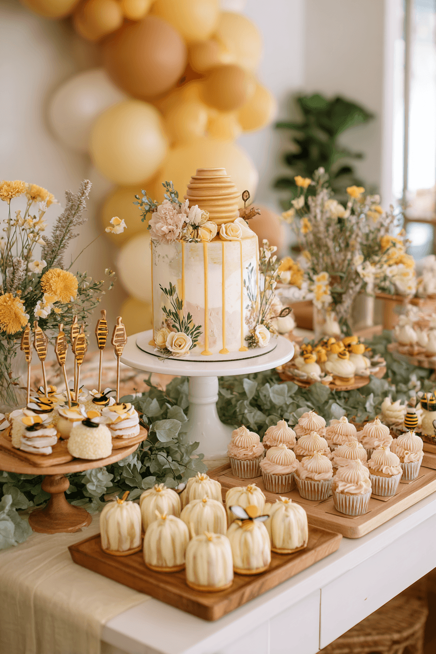 The dessert table for this Beehive party is soft, beautiful, and botanically lush. The centerpiece is a single-tier honey drip cake crowned with a fondant beehive sculpture and a cascade of fresh pale yellow roses, cream florals, and botanical sprigs. Around it, wooden cake stands and boards hold rows of honey-frosted cupcakes with miniature fondant bee toppers, dome-shaped mini beehive cakes, and bee-stripe chocolate macarons. Clusters of sage eucalyptus are tucked between every display piece, creating a garden-party feel that weaves seamlessly through the entire table.