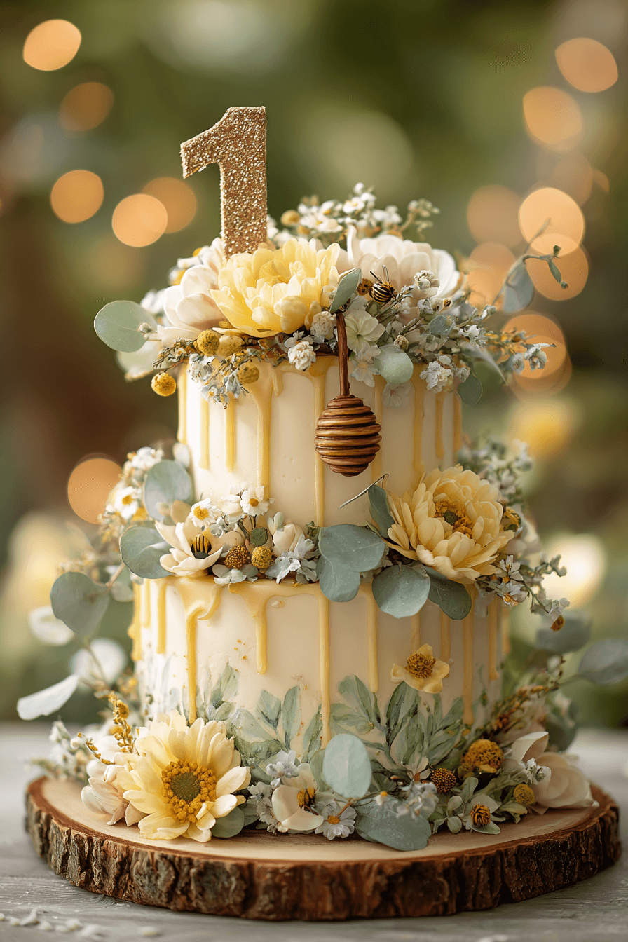The cake for this Bee Beehive party is a masterpiece of botanical artistry. A tall two-tiered design on a natural wood slice features a smooth ivory buttercream base on both tiers, with a delicate pale yellow honey drip running down the top and a deeper amber caramel drip pooling elegantly at the mid-tier. Clustered across both tiers are fresh and dried yellow chrysanthemums, white daisies, chamomile blossoms, and sage eucalyptus leaves, layered so densely that the cake almost disappears beneath the botanical crown. A miniature wooden honey dipper leans against the top tier, and a gold glitter number "1" topper crowns the floral arrangement.