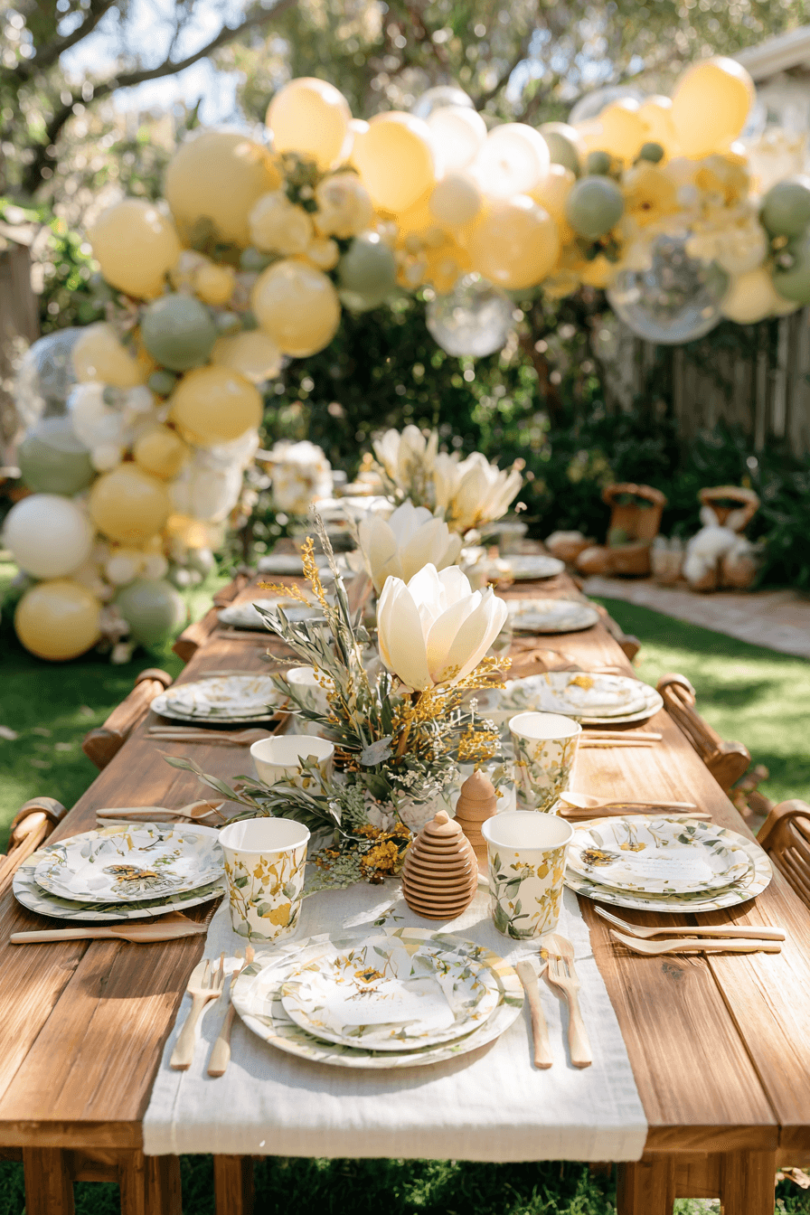 A bright, airy butter yellow and cream balloon garland arches gently above the entire table, softly billowing in the outdoor breeze. With garden greenery blurred in the background and warm sunlight falling across the natural wood surface, the whole scene photographs in a way that feels almost cinematic. It's a tablescape that looks as if it grew there naturally — which is exactly what makes it so beautiful.