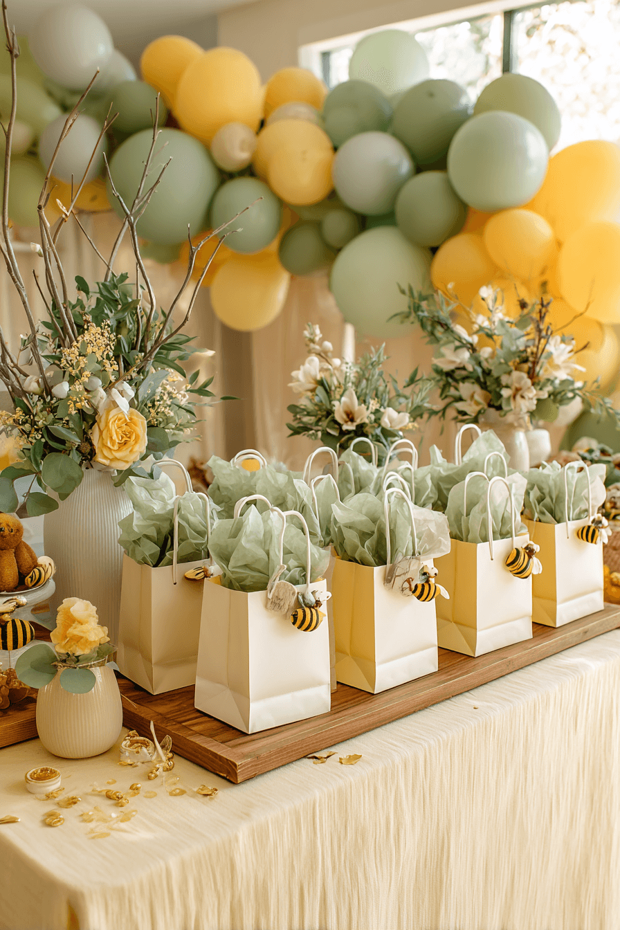 The favor table for this Bee Beehive party is clean, elegant, and wonderfully styled. A long cream linen-covered table holds rows of white and soft yellow favor bags — each one adorned with a simple illustrated bee charm attached to the handle — filled with sage green tissue paper that perfectly matches the overall palette. Tall white ceramic vases filled with eucalyptus and dried yellow roses anchor each end of the table, and small botanical arrangements and wooden honeycomb accents are scattered between the bags. Gold bee confetti glitters across the linen surface, catching the light from the window behind.