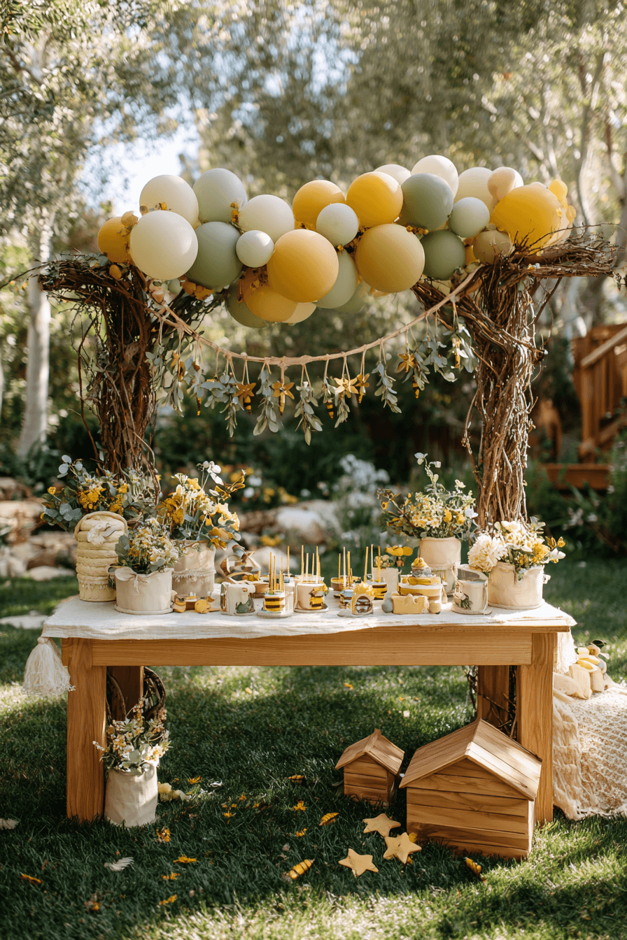 If you've been dreaming of a honeybee birthday party with a rustic, woodland twist — the kind that feels like it was set up in an enchanted garden at the edge of a wildflower meadow — then this Bee Beehive party is the one. This theme takes the honeybee world and grounds it in the most beautiful, earthy way: twisted branch arches, hanging beehive lanterns, sage and butter yellow balloons, and dried botanicals everywhere you look.