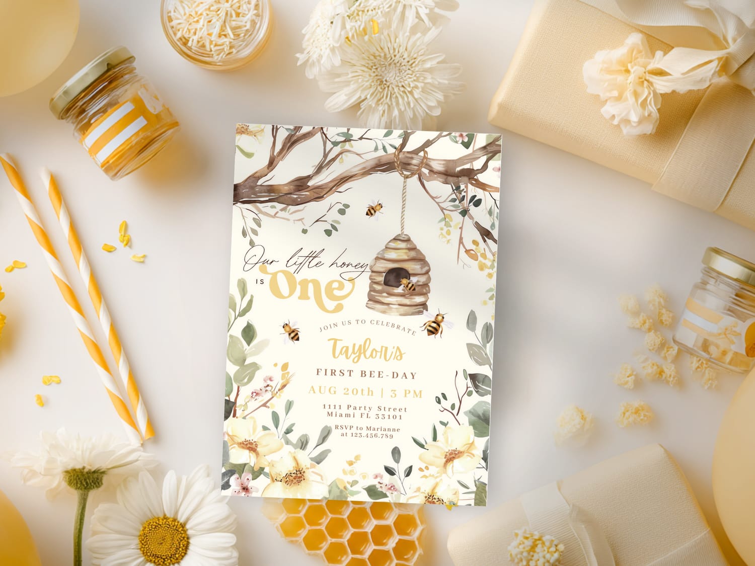 The invitation for this Beehive party is absolutely enchanting. A watercolor beehive hangs from a gnarled, illustrated tree branch against a soft sage-toned background, with illustrated bees buzzing gently around it and botanical leaves and pale yellow blossoms trailing along the bottom border. The "Our Little Honey is One" script in warm amber and the hand-lettered party details below give it a storybook quality that feels unlike any other bee invitation on the market.