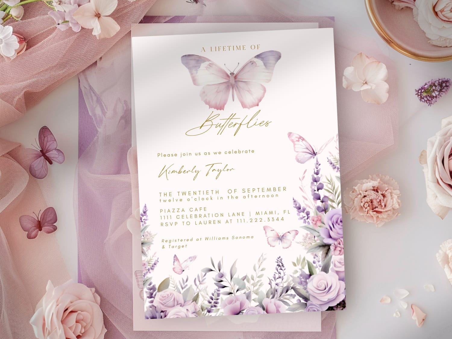 Invitations are your guests’ first glimpse into the magic, and with a butterfly bridal shower invitation, the design should feel just as enchanting as the event itself. Think watercolor illustrations of butterflies and blossoms, foil-pressed gold wings, or delicate cutouts that mimic the shape of butterfly wings. Pair these with soft lilac or blush paper and elegant calligraphy, and you’ve got a piece of art that doubles as a keepsake.