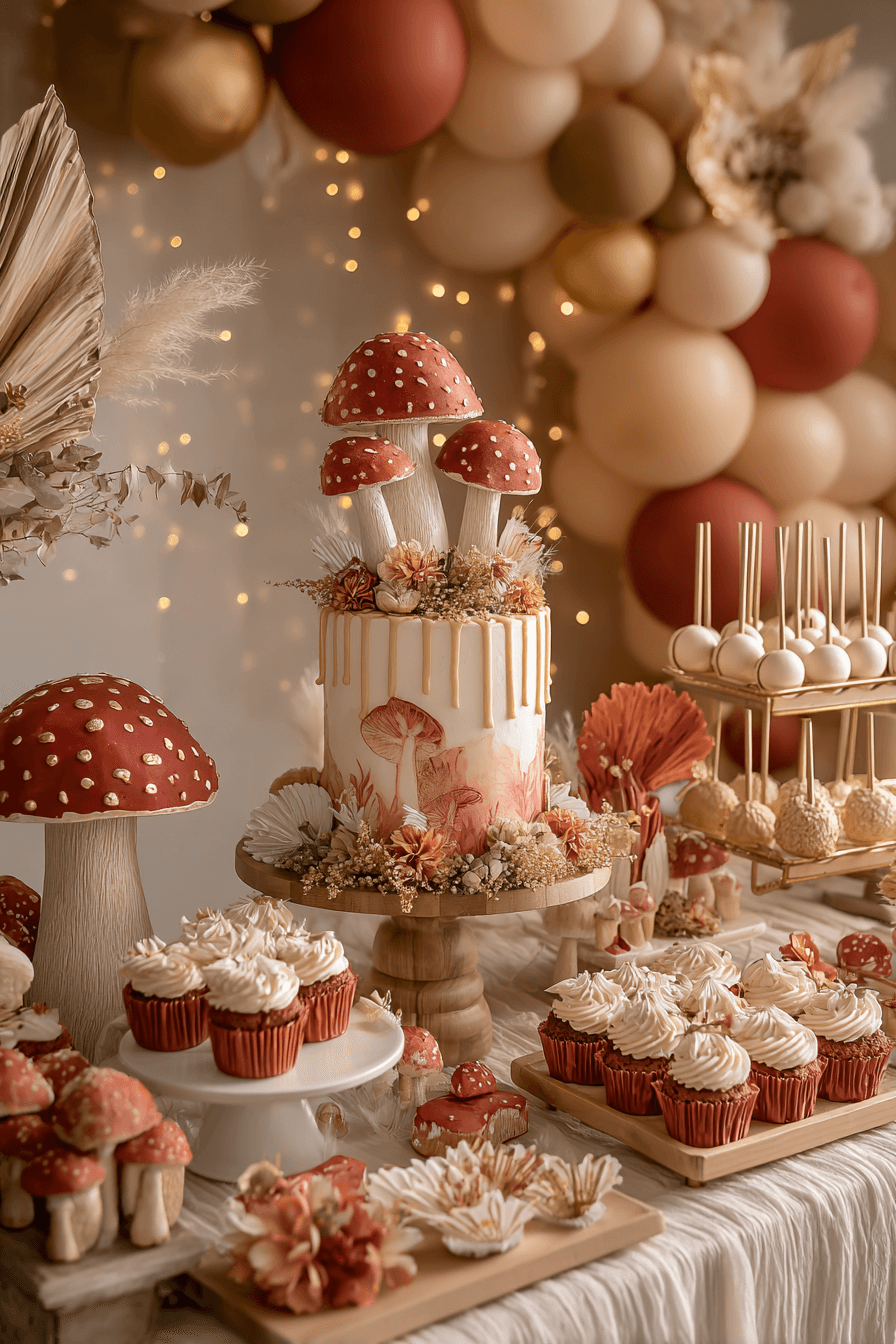 This dessert table is one of the most extraordinary setups in this entire collection — and the mushroom cake is genuinely unlike anything we have ever seen. The hero is a single-tier white buttercream cake with a gold drip, hand-painted mushroom stem details around the base, and dried floral and botanical accents nestled at the bottom edge. Rising from the very top of the cake: three full-size fondant mushrooms in deep terracotta with white spots — tall, sculptural, and absolutely breathtaking as a cake centerpiece. On wooden boards and white pedestals all around it: terracotta-wrapped cupcakes with cream piped swirls in varying heights, cream cake pops on gold stands, and small individual mushroom-shaped fondant cookies. Dried pampas, dried palm fans, and botanical arrangements flank the back of the display. String lights twinkle in the background, and a terracotta and gold balloon garland glows overhead.