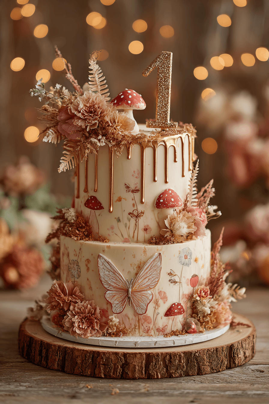 The Fairy First birthday cake is one of those designs that stops a room — and every single detail of it is so thoughtfully executed that guests are going to spend the entire party standing beside it. A two-tiered cream buttercream cake sits on a rustic wood slice stand, catching the warm glow of string lights behind it: the lower tier is hand-painted with the most delicate wildflower meadow scene — pink cosmos, purple wildflowers, red-capped mushrooms, and tiny butterflies all painted across the white base in that soft, pressed-flower illustration style. A single large fondant butterfly with transparent wings rests on the lower tier front. The upper tier carries a warm gold drip, more wildflower painting, and tiny mushroom accents. At the very top: a lush arrangement of dried blush carnations, pink roses, cream dried botanicals, dried ferns, and a red-spotted mushroom — all surrounding a gold "1" topper that rises above it all.