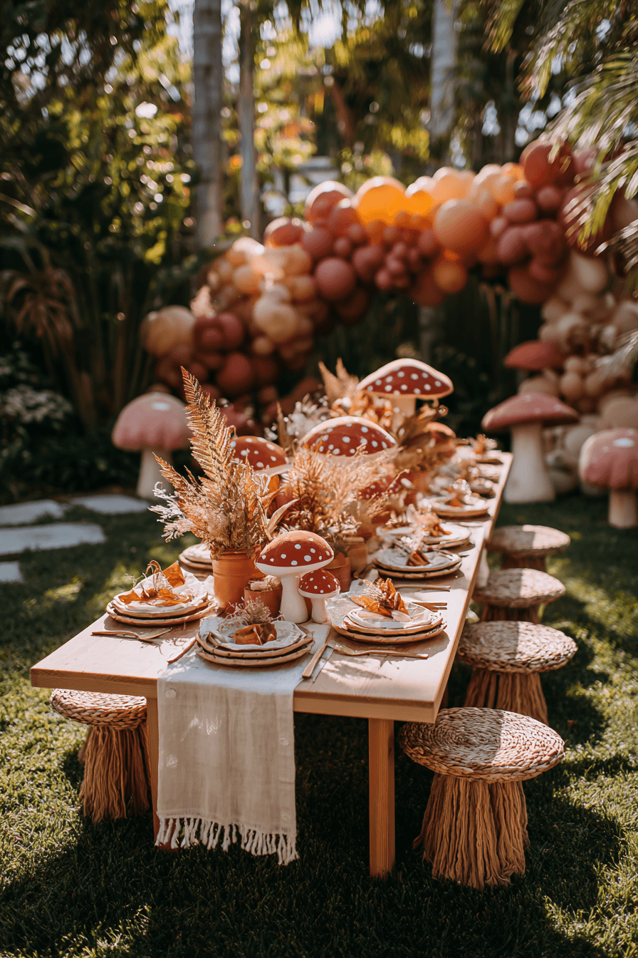 The guest table for a Fairy First party is one of the most beautiful and genuinely atmospheric outdoor tablescapes imaginable — and the mushroom centerpieces are what make it absolutely unforgettable. A long natural wood farm table sits on a lush outdoor lawn with rattan mushroom-shaped stools as seats — the most perfect and completely on-theme seating choice imaginable. A cream linen runner with fringe ends dresses the center of the table, and botanical-print paper plates layered on wood slice chargers sit at every setting with bamboo cutlery. Oversized red-capped mushroom props of varying sizes march down the center of the table as the centerpiece, interspersed with terracotta pots of dried golden grasses and botanicals.
