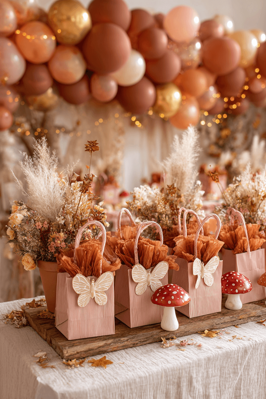 These Fairy First favor bags are some of the most beautifully styled we have ever featured — and the butterfly detail makes them completely special. Blush pink ribbed kraft gift bags with pink rope handles, each one filled with warm terracotta tissue paper and overflowing with dried botanical accents in amber and blush. A delicate butterfly accent on the front of each bag adds a beautiful, completely on-theme finishing touch. Set out on a rustic wooden board on the table, surrounded by red and white spotted mushroom props, scattered dried autumn leaves, and the warm terracotta and gold balloon garland glowing behind — the whole favor display looks like it was styled for an editorial shoot.