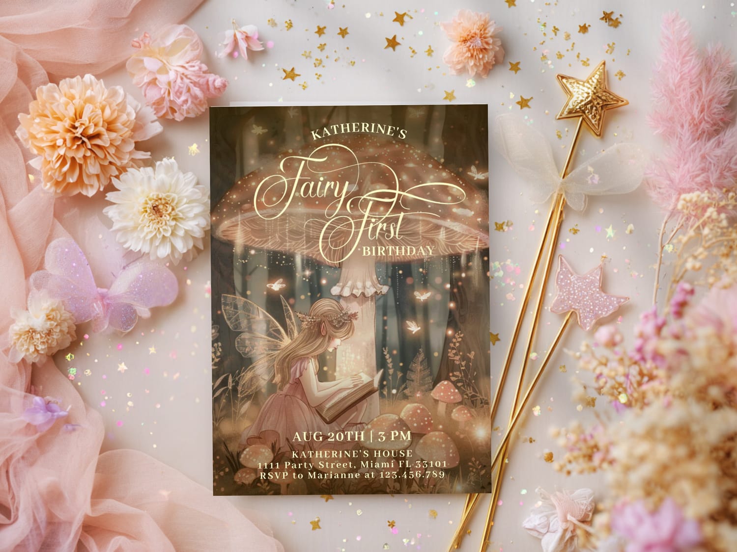 The Fairy First invitation is genuinely one of the most atmospheric and beautiful first birthday designs we have ever seen — and it creates the most powerful first impression of any invitation in this collection. Against a deep, moody forest background — warm browns, soft golds, and the gentle glow of firefly light — a fairy girl with gossamer wings sits beneath a glowing mushroom cap, reading a book of magic by the light of tiny floating sprites. Red-capped toadstools, wild grasses, and enchanted woodland details surround her in every direction. The "Fairy First Birthday" headline in luminous cream script glows above it all like moonlight through the trees.