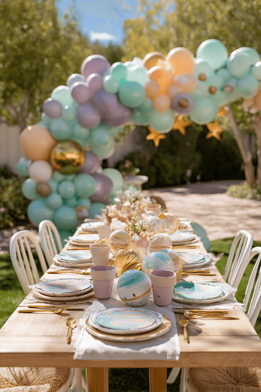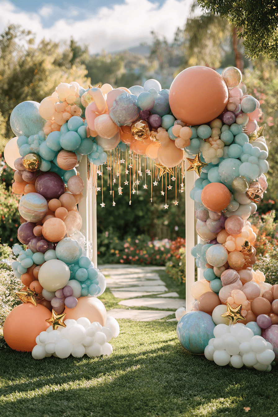 The balloon arch for this theme is the showstopper of the entire setup — and when it's done right, it looks like a piece of living art. Think an organic, full arch in soft peach, dusty mint, cream, lilac, and muted blue, with oversized balloons mixed with smaller clusters for that lush, dimensional look. Scattered throughout are gold foil star accents that catch the light and add just the right amount of celestial sparkle. Set against a manicured green lawn in soft golden sunlight, the whole scene feels like a portal into another world.