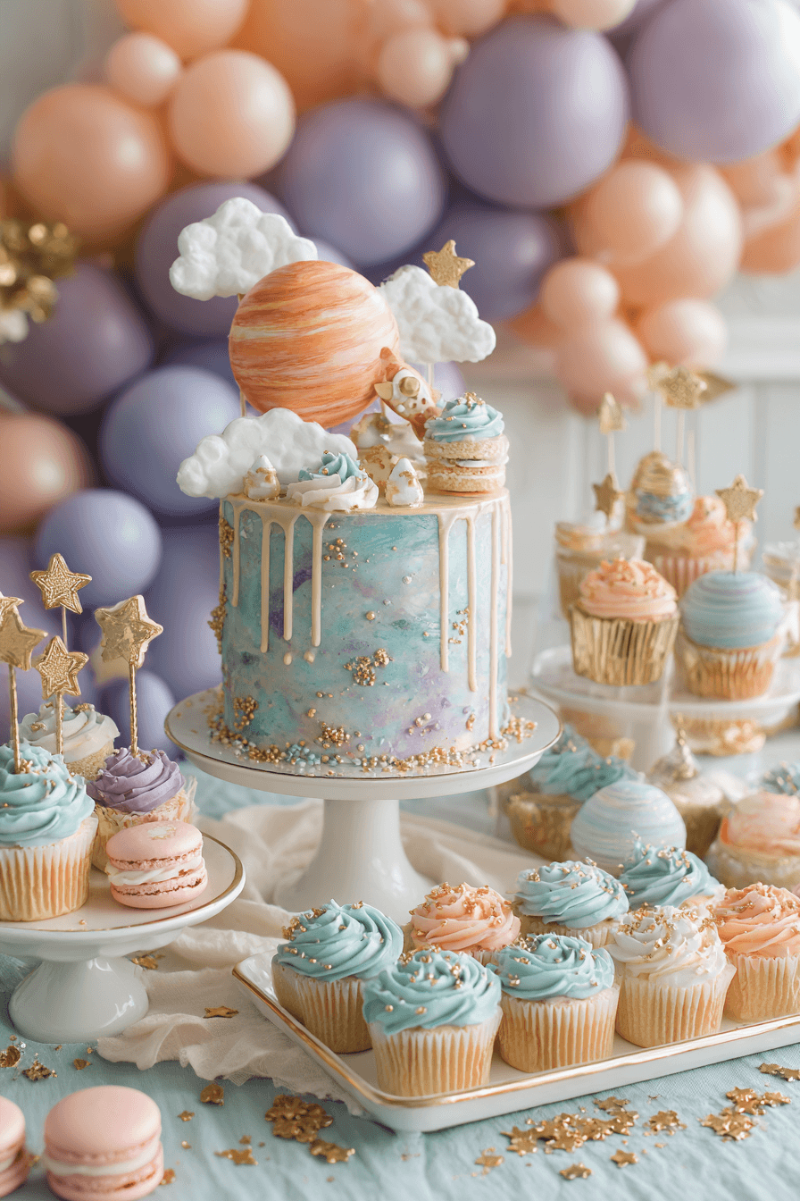 The dessert table for a first trip around the sun party is where the galaxy truly comes to life. Center it all around a stunning galaxy drip cake in swirled dusty blue, soft lavender, and peach — then let the spreads of cupcakes, macarons, and themed treats orbit around it like little planets. Cupcakes in mint and peach frosting, pastel French macarons in blush and lavender, and gold star cake pops scattered across tiered stands create the most magical sweet universe.
