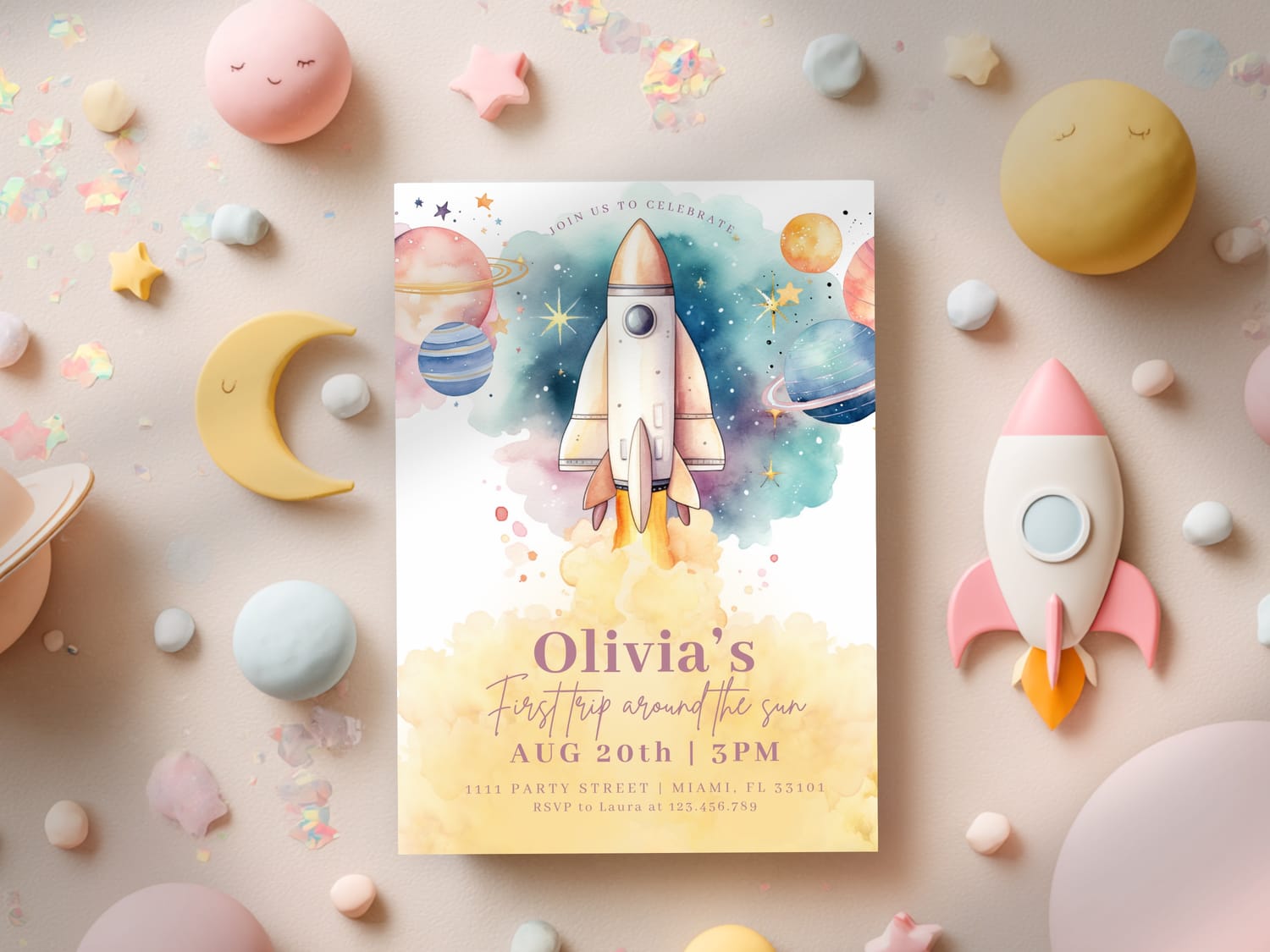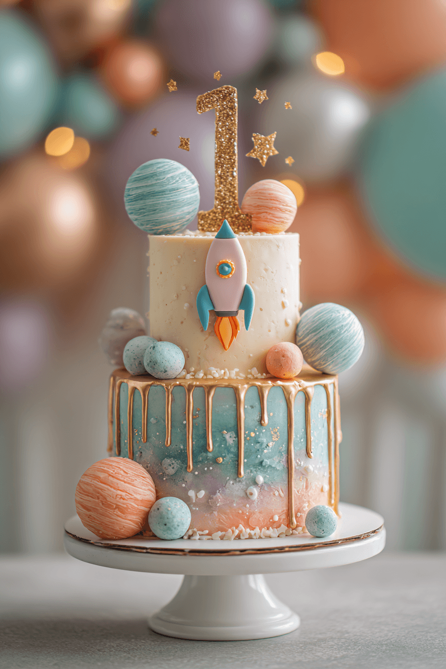 Planning a first trip around the sun birthday party is one of those joyful creative projects where every little detail you add makes the whole picture more magical. From the watercolor rocket invitation to the galaxy drip cake to the pastel tablescape glowing in the afternoon sun — every element works together to celebrate something truly worth marking: one full, beautiful year of your little one's life.