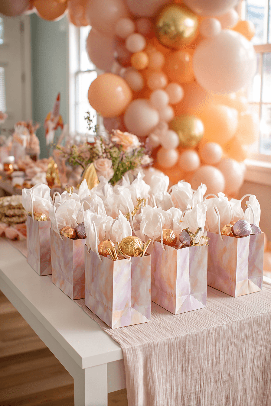 For the favor table, think soft, shimmering, and celestial. Iridescent or peach marble-print goodie bags lined up in neat rows look gorgeous — fill them with planet-shaped chocolates wrapped in gold foil, star-shaped gummies, a mini rocket ship eraser or toy, and a small planet sticker sheet for little explorers. Tuck in a gold star wand or a mini constellation card to make each bag feel extra special and themed.