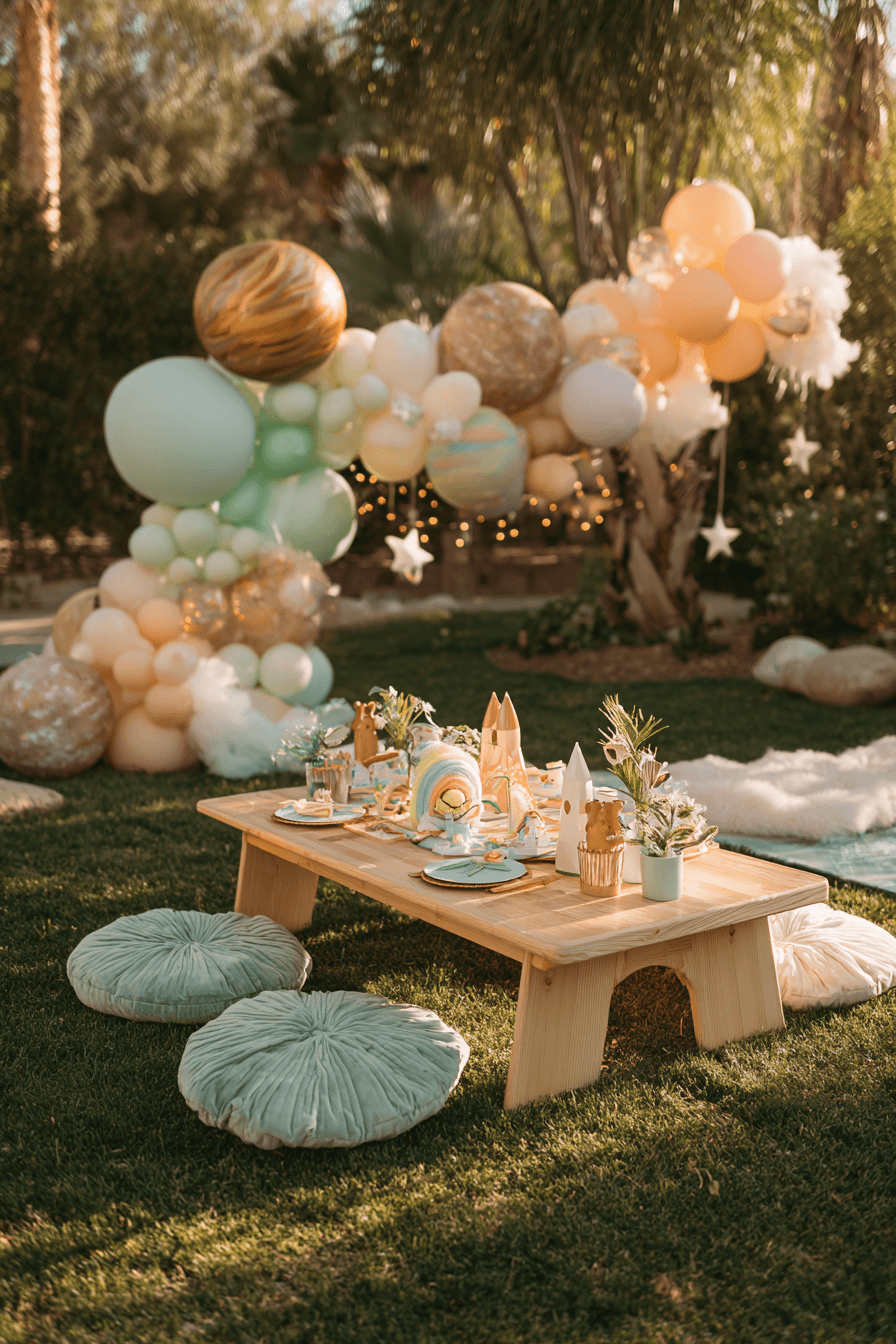 Since this is a first birthday, the activities are really designed for the adults and older siblings to enjoy while the baby of honor soaks up all the love. Set up an outdoor activity station on the lawn — a low wooden play table surrounded by plush floor cushions in sage and cream makes the most adorable play zone. Fill the table with sensory-safe space toys: soft planet plushies, rubber rocket ship toys, star-shaped wooden blocks, and lightweight constellation books.