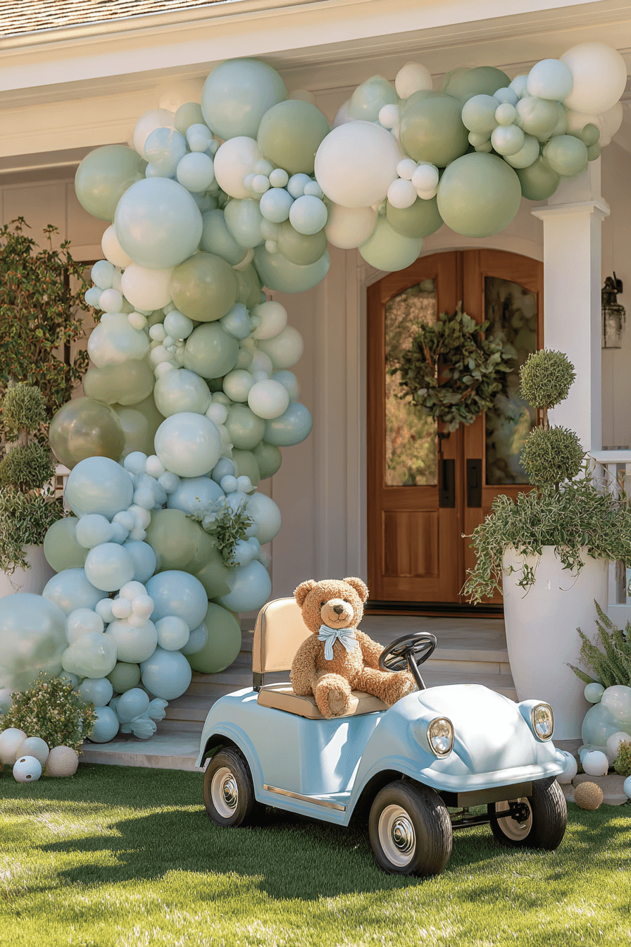 The moment guests arrive and see that sweeping balloon arch framing the entrance, the whole vibe of the party clicks into place. This Golf Bear arch is a study in soft, sophisticated color — sage green, mint, powder blue, and white balloons in varied sizes creating that lush organic cloud shape that photographs so beautifully. Tucked throughout the arrangement: sprigs of fresh greenery and a scattering of golf balls at the base. And sitting right in the driver's seat of a baby blue miniature golf cart, a teddy bear in a bow tie — the most charming prop detail you can imagine.
