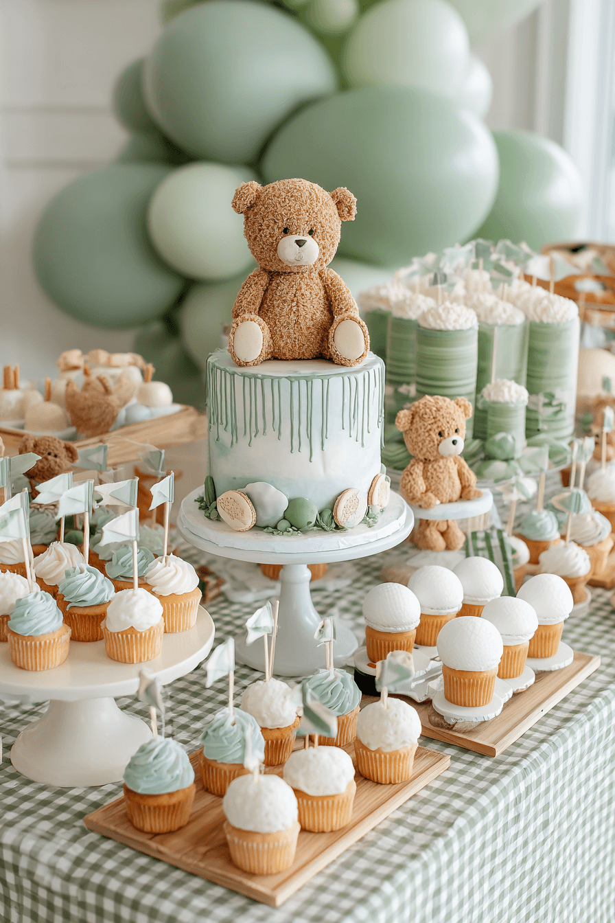The styling detail that really makes this table sing is the mix of textures — the soft fondant bear against the glossy drip cake, the delicate piped swirls on the cupcakes, the smooth spheres of the cake pops. Every element has its own moment, but together they create something cohesive and genuinely stunning. A small teddy bear figurine placed beside the cake adds a sweet, story-telling touch that guests will notice and love.