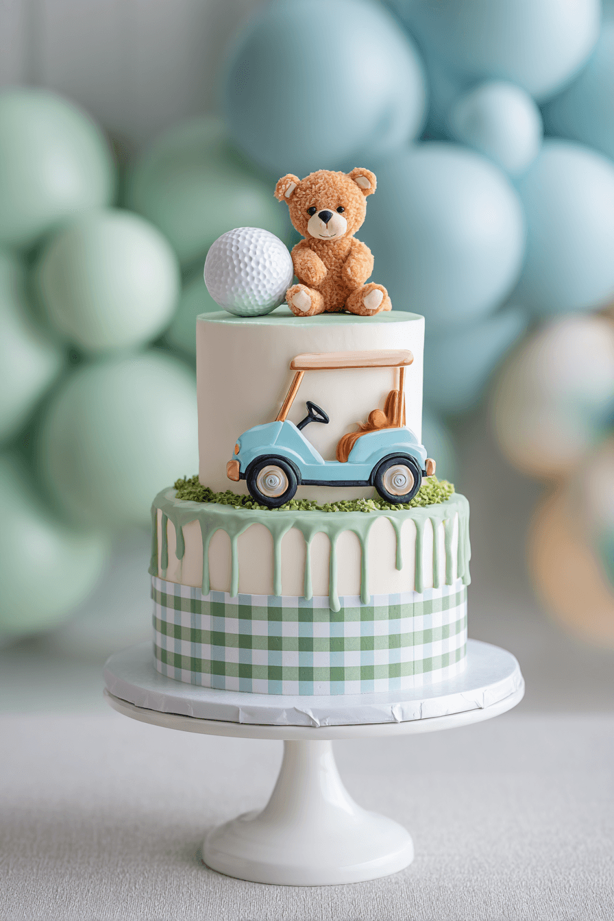 The Golf Bear birthday cake is a showstopper in every sense — and the design we're obsessed with combines two of the theme's best elements into one breathtaking two-tiered creation. The lower tier features a green and white gingham fondant wrap that's absolutely charming, topped with a sage green drip cascading down the middle tier. On the upper tier, a fondant blue golf cart with gold detailing sits on a bed of edible grass, and perched right on top — a fondant teddy bear cuddled up next to a golf ball, bow tie and all. It's the kind of cake that gets its own corner of the Instagram grid.