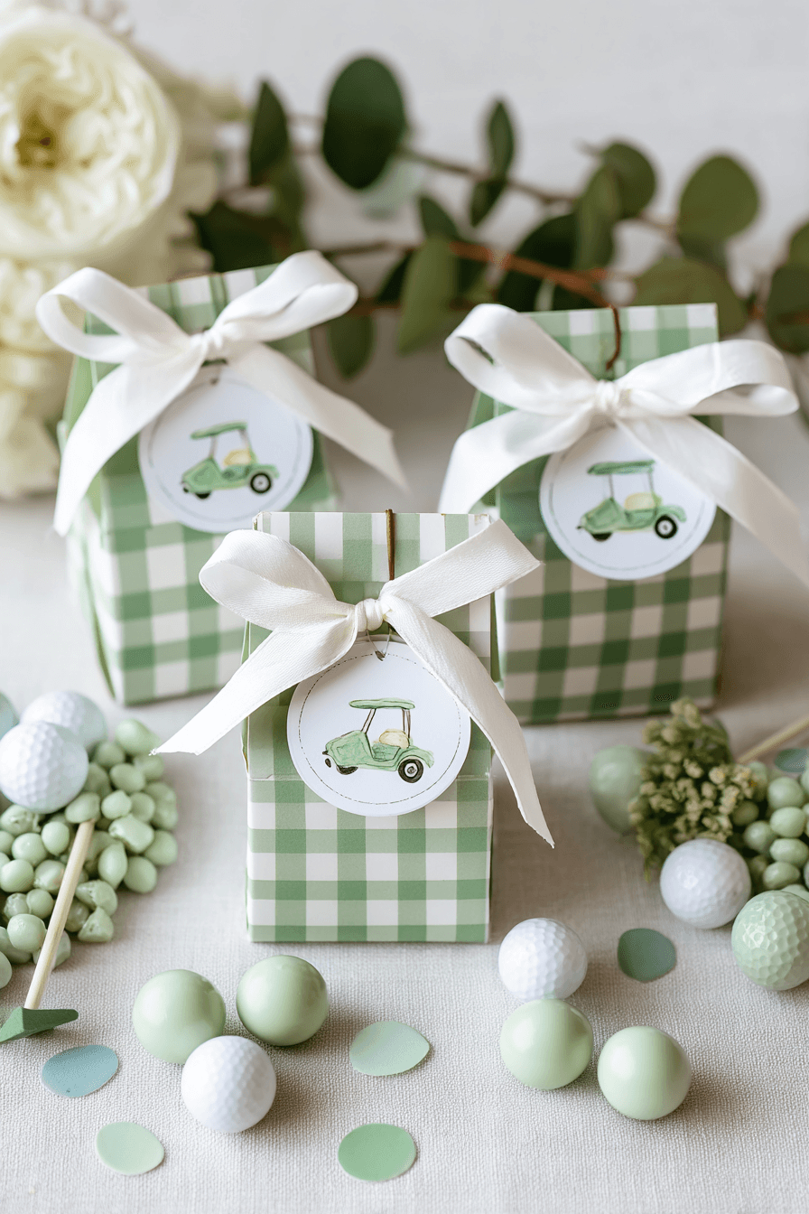 These Golf Bear favor boxes might be the most refined little detail of the whole party — and they couldn't be simpler to put together. Green and white gingham kraft boxes tied with a wide cream satin ribbon bow, each one finished with a round tag featuring a watercolor golf cart illustration. Set out on a table surrounded by mini golf balls, green candy-coated chocolates, and sprigs of eucalyptus, they look like they came straight from a boutique gift shop — and every guest is going to love taking one home.