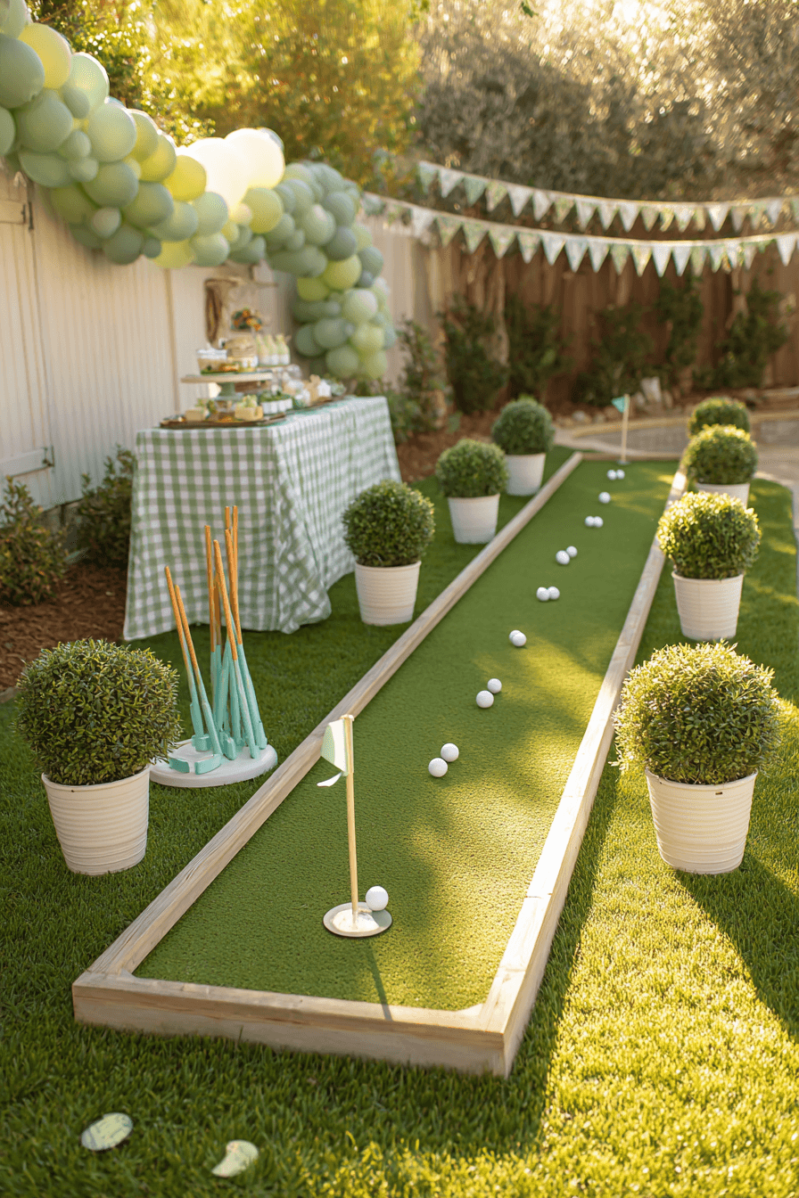 The activity station for a Golf Bear party is genuinely one of the most impressive setups we've ever seen for a first birthday — and it's more achievable than you'd think. The star of the show is a full mini putting green built right into the backyard: a long strip of artificial turf in a wooden frame, flanked on both sides by round topiary bushes in white pots and a set of child-size teal golf clubs standing ready at one end. Small white golf balls dot the green, a little flag marks the hole, and a sage and yellow balloon garland curves overhead while a gingham pennant banner strings across the space. It is absolutely stunning and doubles as both an activity and a photo backdrop.