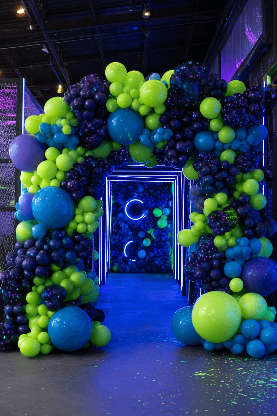 The black-light element is what makes this theme truly special, and setting it up correctly is everything. Opt for neon-colored balloons that are specifically labeled as black-light reactive — these glow brilliantly under UV light in a way that standard neon balloons do not. Black walls or dark draping behind the arch will maximize the glow effect and make the whole entrance feel like stepping into another dimension.