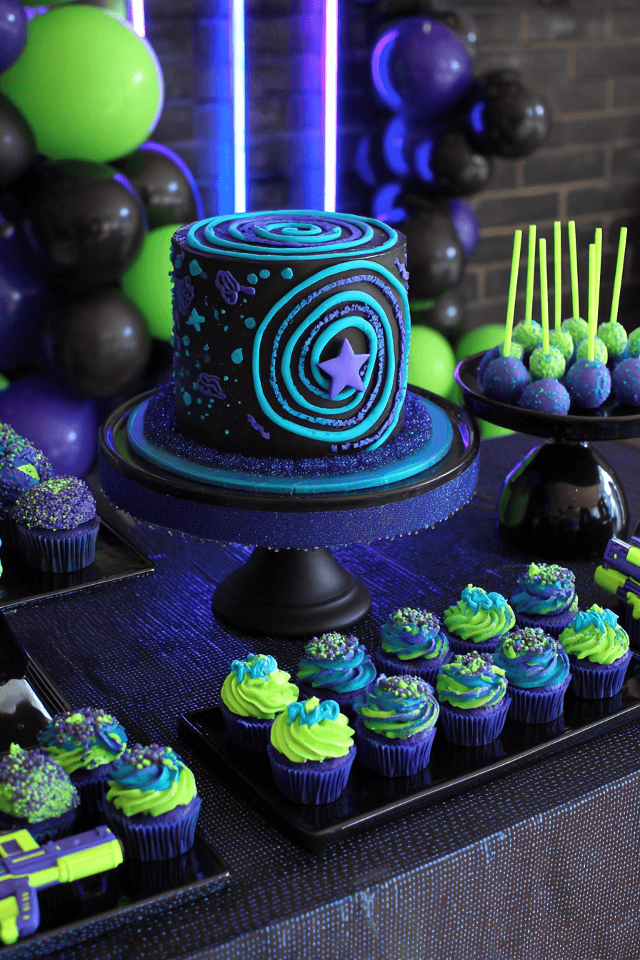 The laser tag dessert table is styled entirely in black, neon green, electric blue, and purple — and it is one of the most visually dramatic dessert setups in kids party design. The centerpiece is a black matte fondant cake with a cyan spiral target design on the front and purple star accents, set on a black pedestal stand over a dark metallic-sheen tablecloth. Surrounding it are neon green, blue, and purple swirl-frosted cupcakes in purple liners, dark purple and black cake pops with neon sprinkle detail on a black stand, and toy laser gun props displayed on the table surface. Neon purple tube lights glow in the background, and a mix of green, purple, and black balloons fills the space above.
