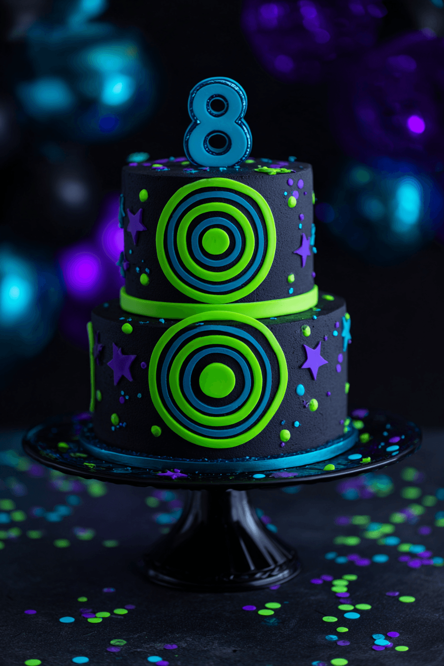 The laser tag birthday cake is one of those designs that genuinely stops people in their tracks, and there are two spectacular versions to consider. The first is a single-tier black matte fondant cake with a hand-piped cyan concentric circle target design on the front, purple star accents, teal and purple splatter details, and a purple fondant star centered in the target. It sits on a black glitter cake stand and radiates pure laser-game energy. The cyan and purple colors against the matte black are electric, and the circular target motif ties directly back to the invitation design.