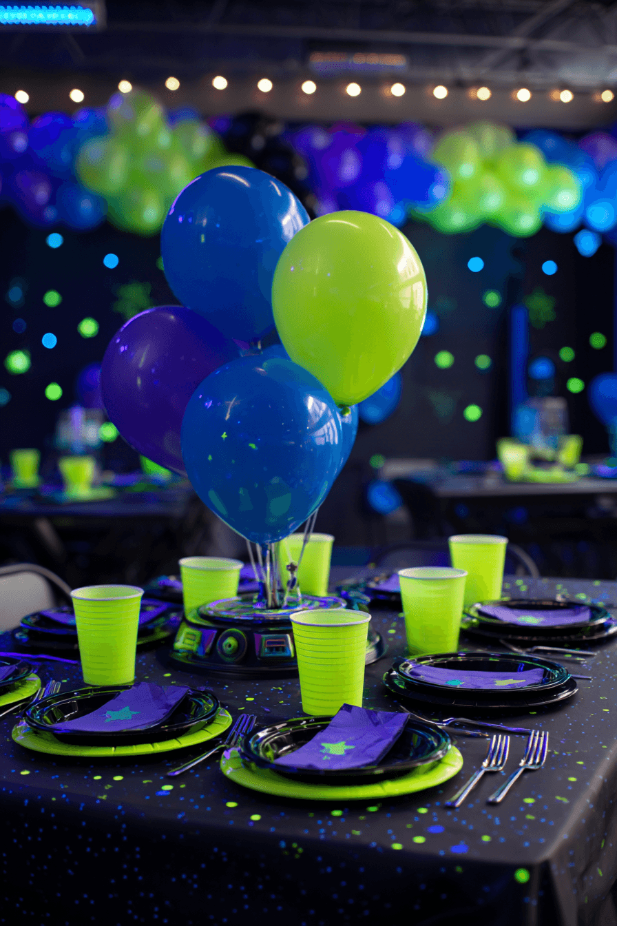 To recreate this tablescape, start with solid black tablecloths, add neon green plates, matching cups, and purple napkins. Scatter neon star confetti across the table surface and add a balloon cluster centerpiece in the theme colors. The black-light reactive elements will do the rest of the styling work for you once the lights go down.
