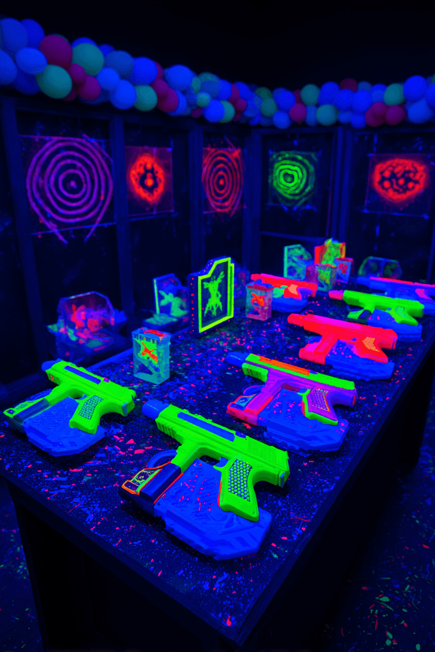What makes this theme so exciting to style is the black-light atmosphere it creates. Every element — the balloons, the dessert table, the plates, the cake — glows and pops against the dark backdrop in a way that is just impossibly cool. It is a theme that works incredibly well in an indoor laser tag venue but translates beautifully to any darkened indoor space with the right lighting and decor.