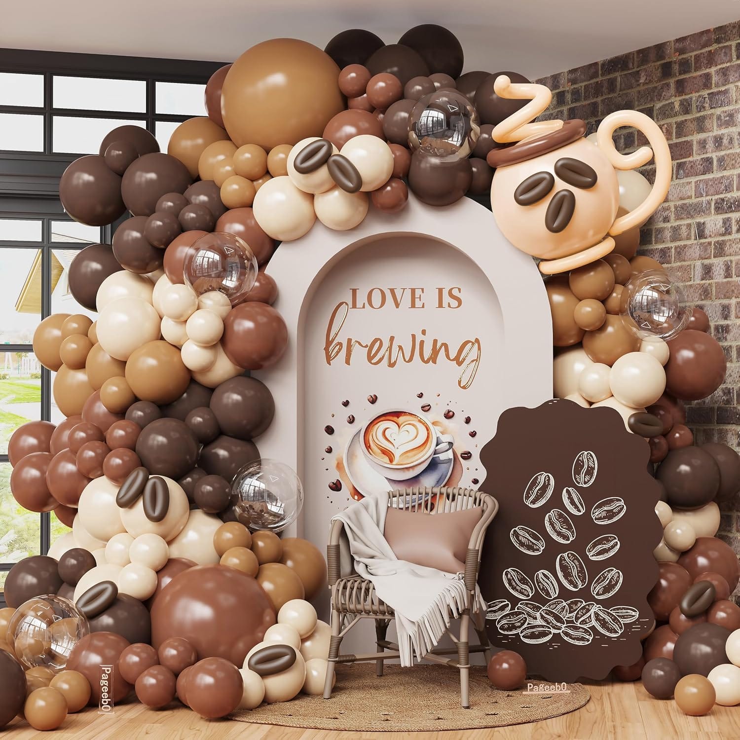 Stunning love is brewing backdrop with neutral balloon arch and coffee shop styling for bridal shower photos