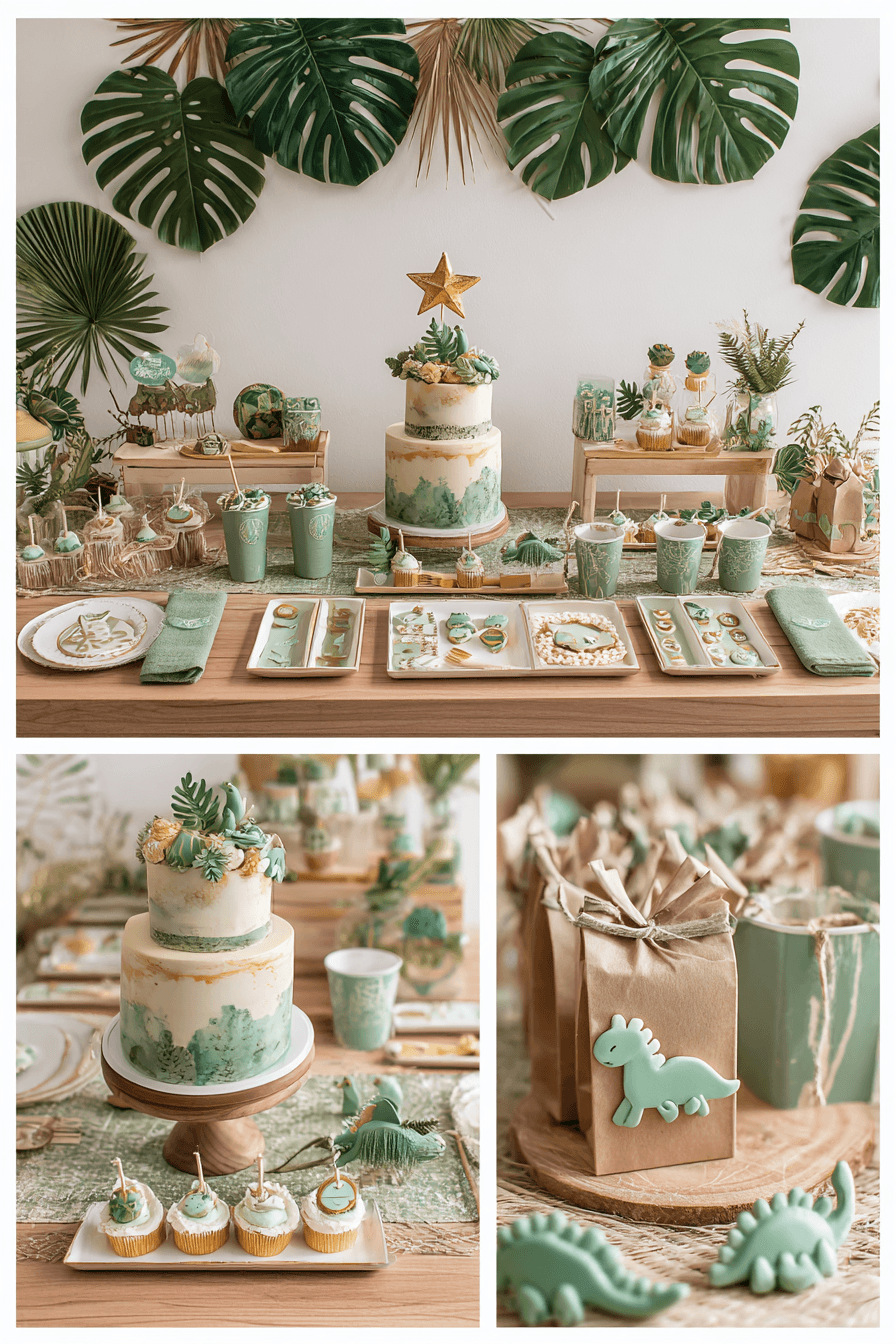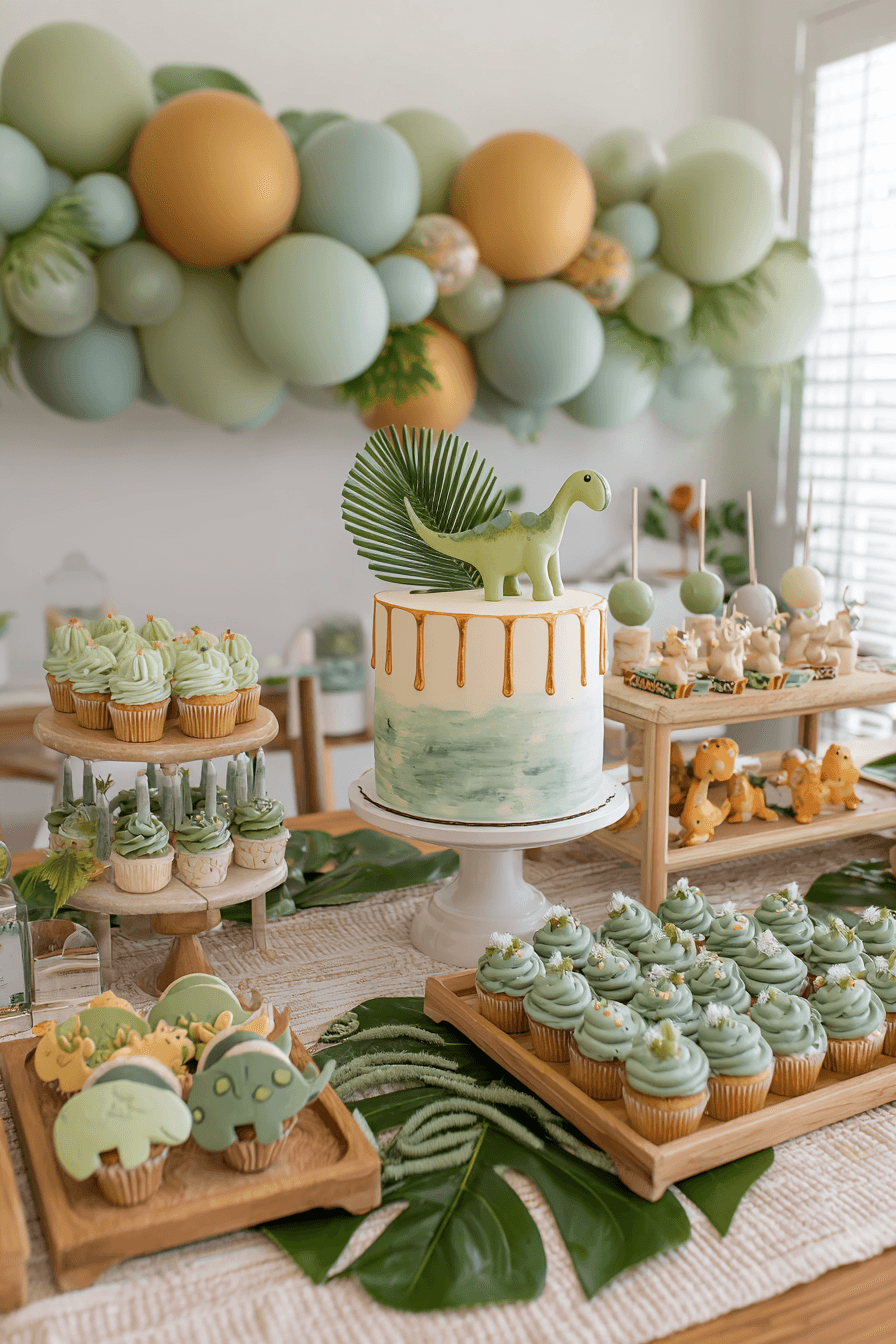 Tying sweets to your color story is what takes a dessert table from cute to truly stunning. Sage green buttercream, gold drizzle, cream fondant, and pops of warm tan throughout the treats create that perfectly cohesive look. Small dino figurines tucked between desserts, a few monstera leaves used as natural props, and gold star confetti scattered across the table surface add the finishing details that make everything feel styled and intentional.