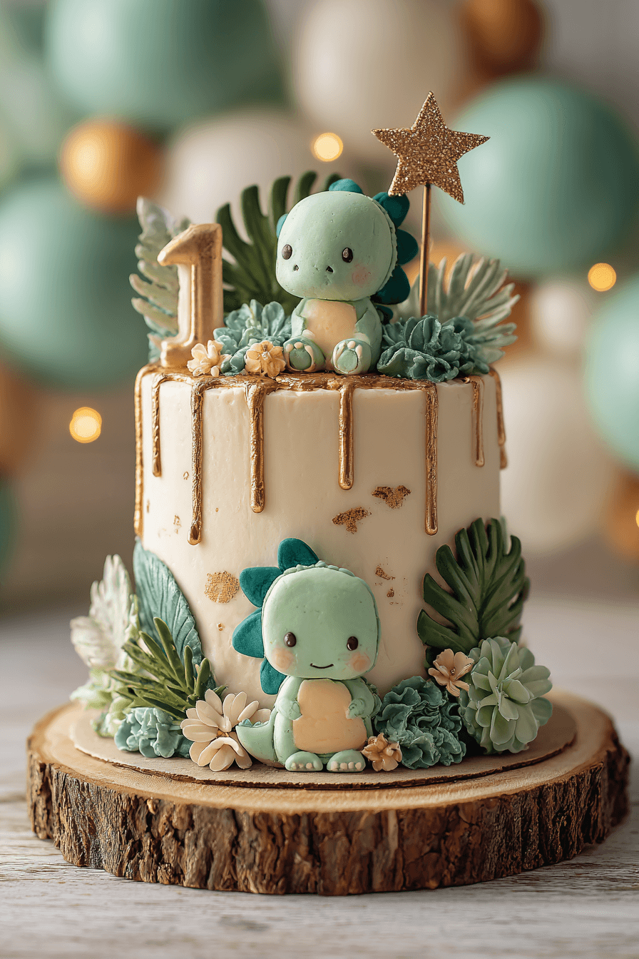 The birthday cake for a One A-Saurus party deserves to be a total showstopper — and the good news is that this theme lends itself to some of the most gorgeous cake designs out there. Picture a two-tiered buttercream cake in soft ivory, with watercolor sage green brushed across the lower tier, a gold drip cascading down the sides, and the cutest fondant baby dinosaur figurines nestled into a crown of sugar succulents and tropical leaves on top. A gold "1" topper and a glittery star wand finish the look with just the right amount of birthday magic.