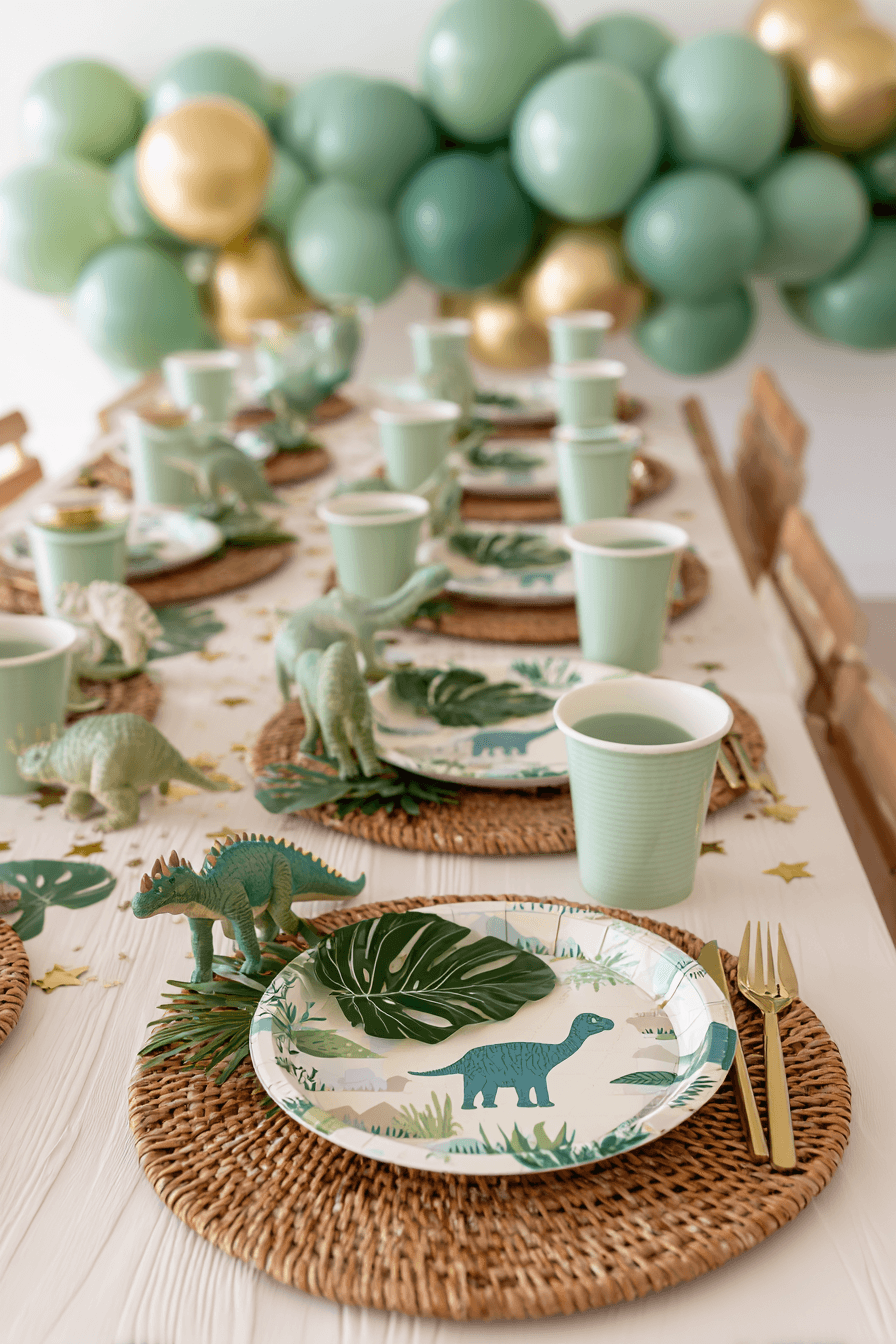 The centerpiece of the table is where you get to have some fun. Small dino figurines placed between place settings act as both décor and take-home favors — kids absolutely love discovering a little dinosaur waiting at their seat. Scatter gold star confetti across the table runner, tuck a few monstera leaf cutouts between settings, and you have a tablescape that feels intentional from every angle. Gold cutlery is a small upgrade that makes a surprisingly big difference in photos.