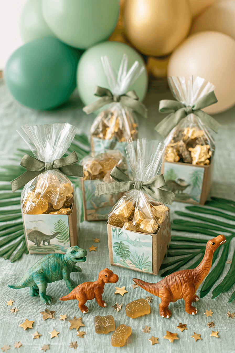 Party favors for a One A-Saurus birthday should feel just as thoughtful and styled as the rest of the celebration — and these dino goodie bags absolutely deliver. Fill clear cellophane bags with gold gummy dinosaurs, dino-shaped gummy candies, and a handful of gold star confetti, then nestle them into kraft paper boxes printed with watercolor dinosaur and tropical leaf designs. Tie each one with a sage green satin ribbon and set a tiny dino figurine beside the box — the result is a favor display that guests will stop to photograph before they even pick one up.
