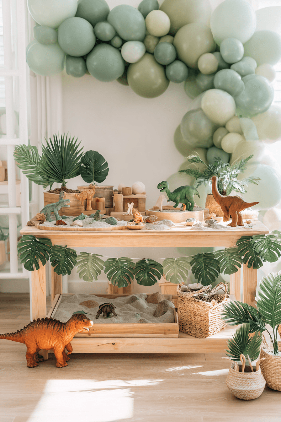 Add a second station with a collection of colorful dino figurines in different sizes — some realistic, some soft rubber — arranged in wooden trays and rattan baskets alongside tropical leaf props. Babies and toddlers are endlessly entertained by these, and older kids love arranging and playing with them too. A sage green balloon arch overhead ties the activity corner into the rest of your party décor seamlessly.