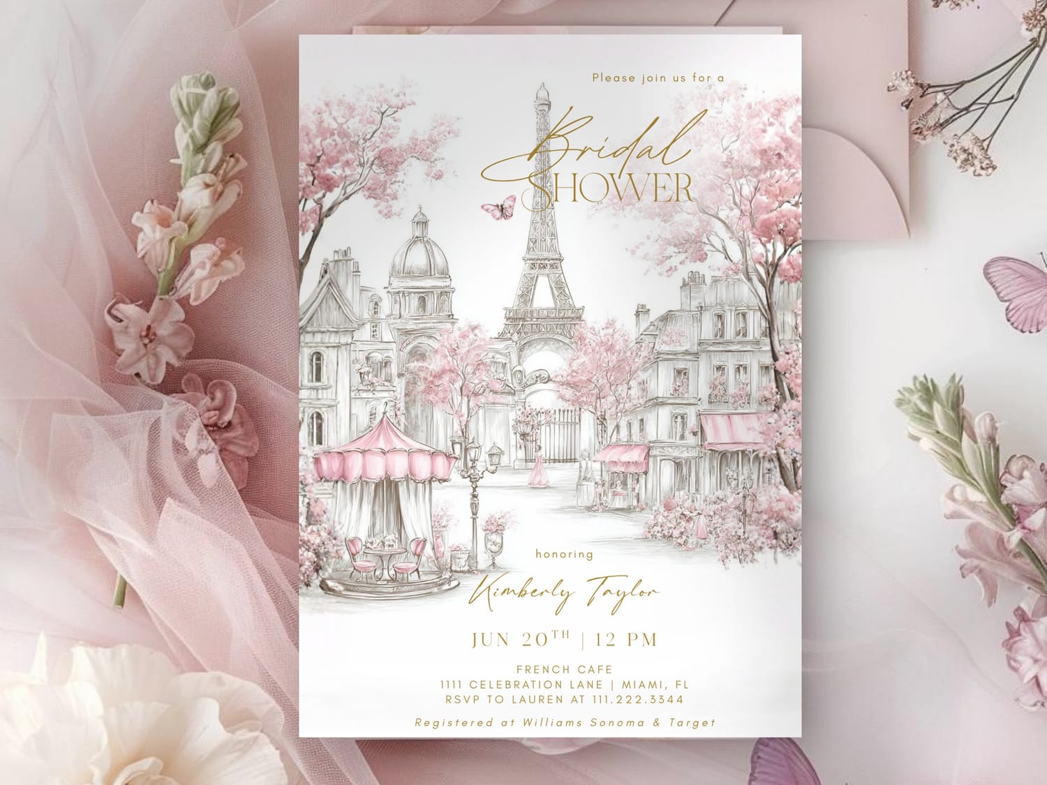 Invitations are the first peek guests will get of your Paris themed bridal shower, so let them set the tone. For this theme, think romantic fonts, soft watercolor florals, or even sketches of the Eiffel Tower. A touch of gold foil or a satin ribbon makes them feel luxe.