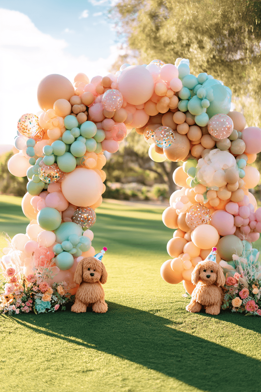 The balloon arch for this puppy birthday party is an absolute showstopper, and the best part is that the palette does all the heavy lifting. Picture a lush, organic arch in soft peach, blush pink, mint green, cream, and confetti-filled clear balloons — full and flowing, set up on a manicured green lawn under warm golden sunlight. Tucked at the base on each side are fluffy plush puppy stuffed animals wearing miniature party hats, and clusters of fresh pink and peach florals complete the ground arrangement. It is the kind of backdrop that makes every single photo look incredible.