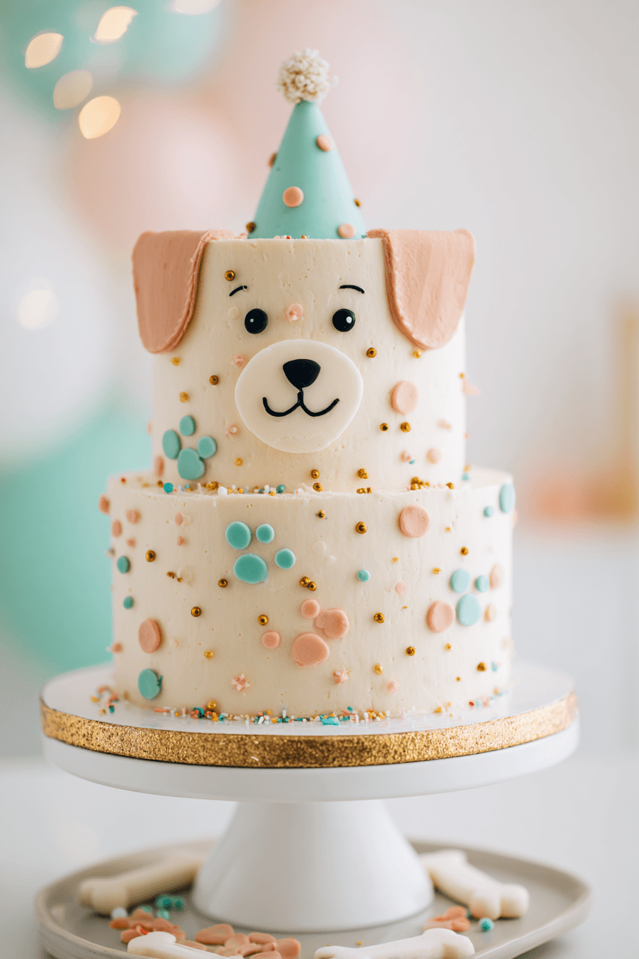 The birthday cake for this puppy party comes in two absolutely dreamy versions — and honestly, choosing between them might be the hardest part of your planning. The first is a single-tier white fondant cake with a sculpted puppy face design: floppy brown ears, rosy pink cheeks, a little black nose, and a mint fondant party hat with confetti dots. It is charming and sweet, perfectly sized for smaller birthday celebrations.
