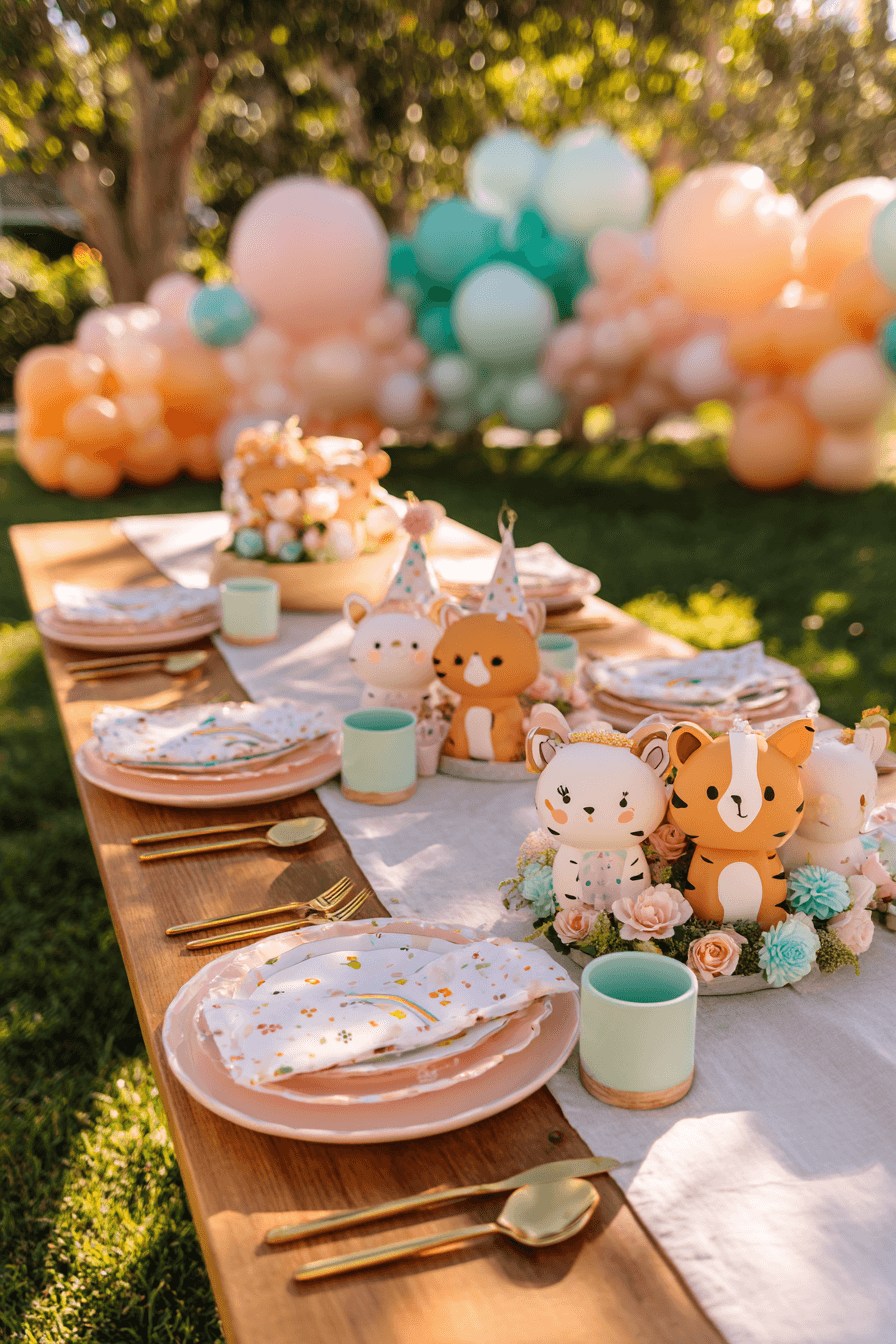 In the background, a lush balloon garland in peach, mint, and pink adds height and color to the outdoor setting, with trees and greenery softly blurred behind it. The whole tablescape feels festive and intentional without being complicated to recreate. It is the kind of setup that looks like it took hours but can come together with a few key pieces in the right palette.