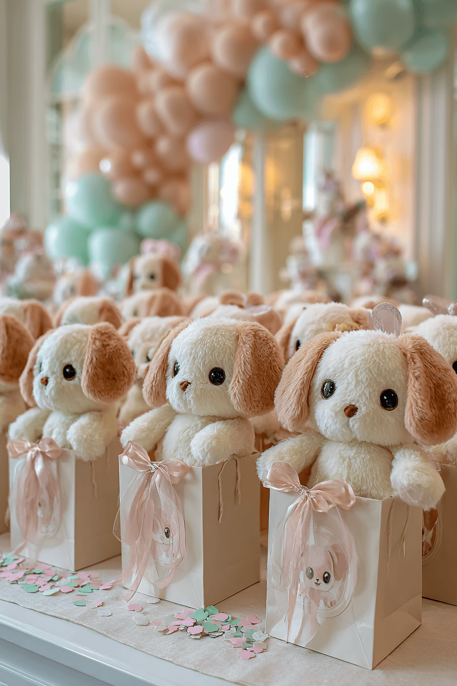 The favor table itself is styled beautifully — white linen covering a long display table, bags lined up in rows, balloon decor above, and those little plush puppies as both the favor and the display prop all in one. It is a setup that photographs like a dream and doubles as part of your overall party decor until guests are ready to head home.