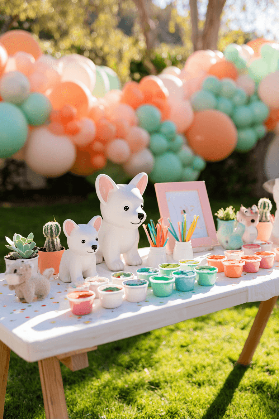 The activity station for this puppy party is set up outdoors and it is one of those ideas that kids absolutely love — a paint-your-own-puppy station. Each child gets an unpainted ceramic dog figure and a set of paint cups in the party palette: pink, mint, teal, peach, and orange. Brushes are laid out, a framed party sign adds to the decor, and small themed props and confetti make the table feel festive and fun. The balloon garland in the background ties the activity area right into the rest of the party. Kids take their painted pup home as part of their favor, which means the activity and the takeaway are one and the same.
