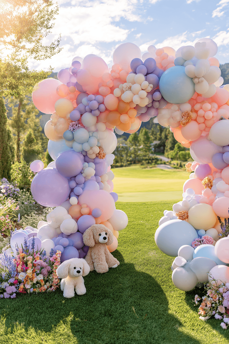 The balloon arch for this puppy party is one of the most breathtaking outdoor setups in any pastel kids birthday theme — and that is truly saying something. Set up on a manicured green lawn with mountain views and golden trees softly blurred behind it, the enormous organic arch rises and curves in the most lush, full way, featuring lavender, soft pink, peach, cream, sky blue, and yellow balloons in a range of sizes. Small dried floral clusters are tucked into the balloons at intervals throughout the arch, adding a garden-fresh texture that makes the whole installation feel incredibly layered and special. At the base on the left side, two plush puppy stuffed animals — one cream and one caramel — sit side by side on the grass, the most perfect and photogenic finishing touch.