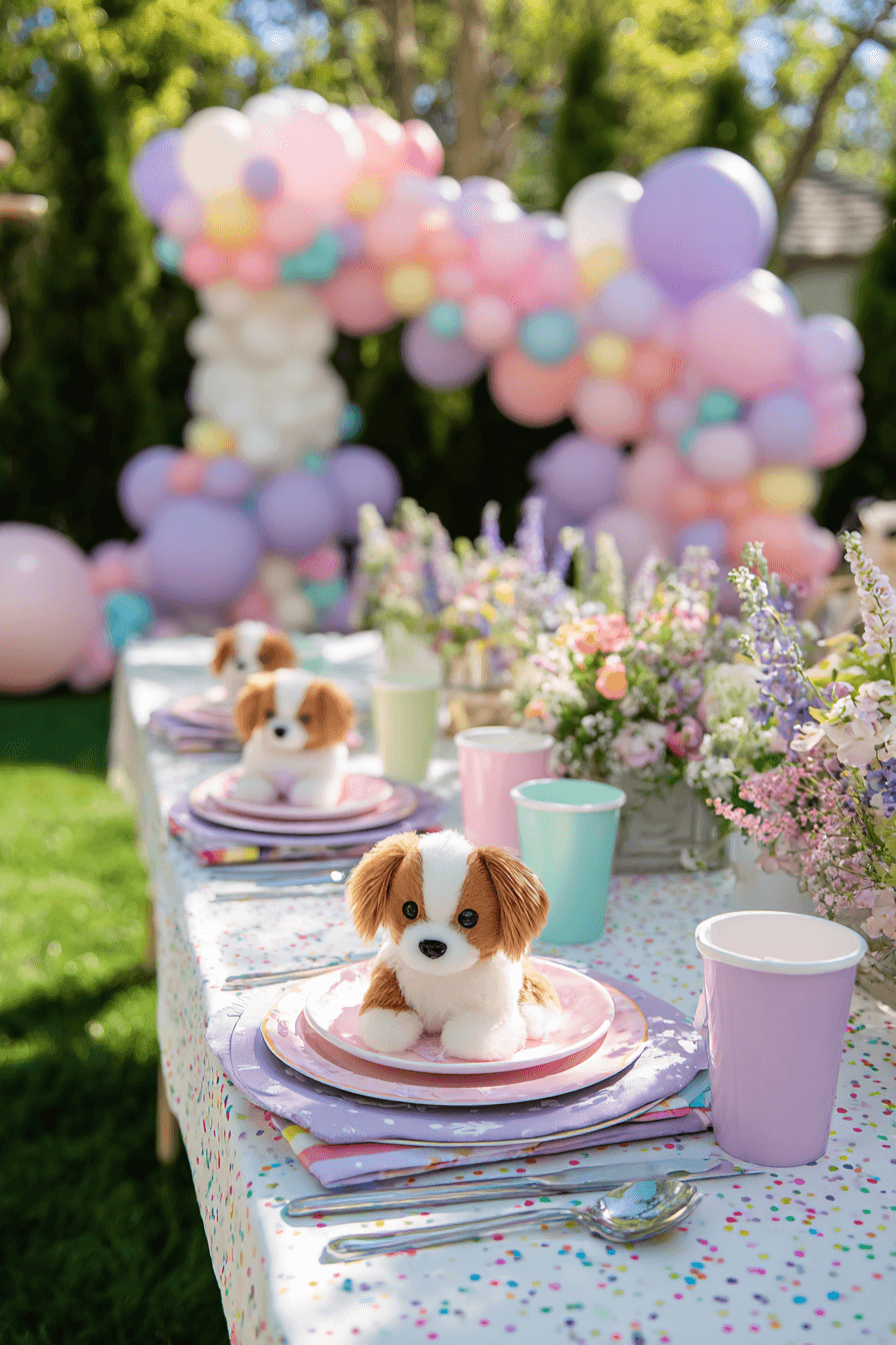 To recreate this tablescape, start with the confetti-print tablecloth — it sets the playful, festive tone immediately. Layer in your pink plates, alternating pastel cups, and silver cutlery, then place a small plush puppy at each setting. A simple mixed floral centerpiece in the party palette pulls everything together beautifully, and the balloon arch behind the table does the rest.