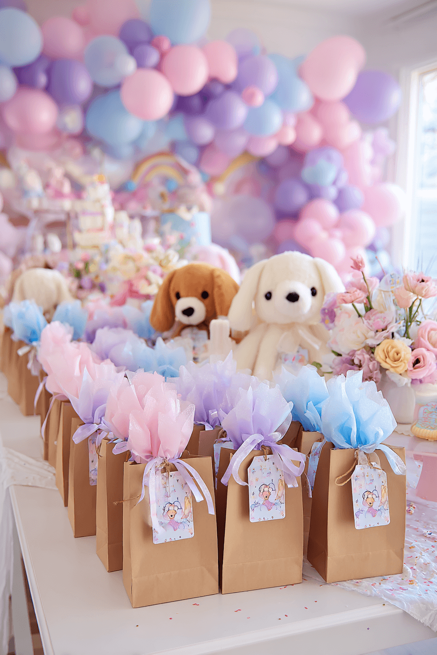 The favor display for this puppy party is set up indoors against the most beautiful backdrop of pink, purple, and blue balloons — and it is every bit as dreamy as the rest of the celebration. Kraft paper bags with pastel tissue paper in pink, lavender, and sky blue blooming generously from the top are lined up in rows on a white display table. Each bag is tied with a lavender ribbon bow and finished with a sweet puppy-themed gift tag featuring illustrated dog and balloon artwork. Behind the bags, two large plush puppy stuffed animals — one caramel and one cream — are displayed as props, and a white vase filled with fresh pink roses and ranunculus adds warmth and elegance to the whole display.