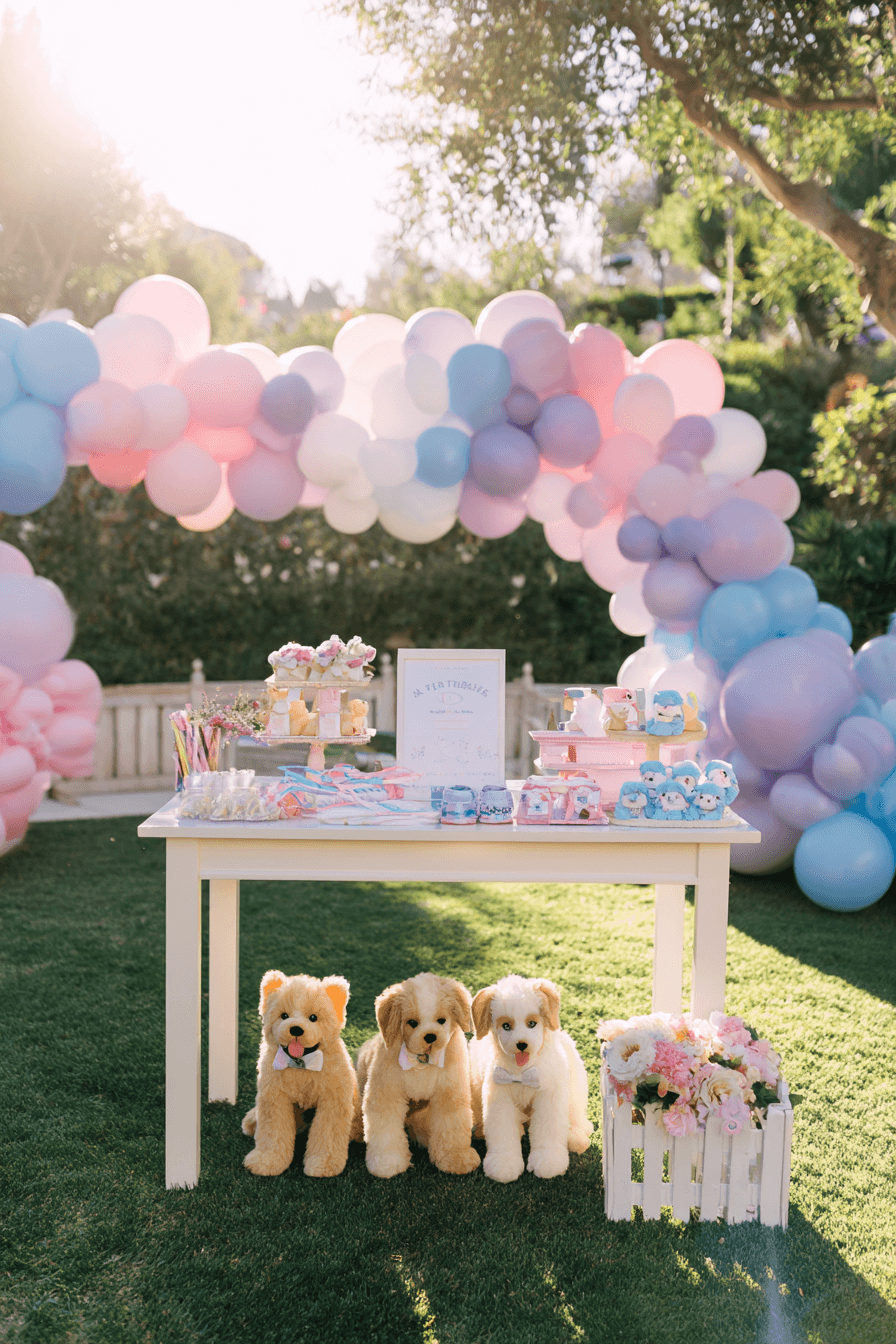 What makes this theme so special is how completely it commits to the pastel rainbow dream. Unlike bolder puppy party interpretations, this one leans fully into the most delicate, whimsical tones — lavender balloon arches taller than the trees, watercolor rainbow birthday cakes, and plush puppy stuffed animals tucked into every corner of the celebration. It is a theme that feels genuinely magical, and it photographs like a fairytale from the very first snap.