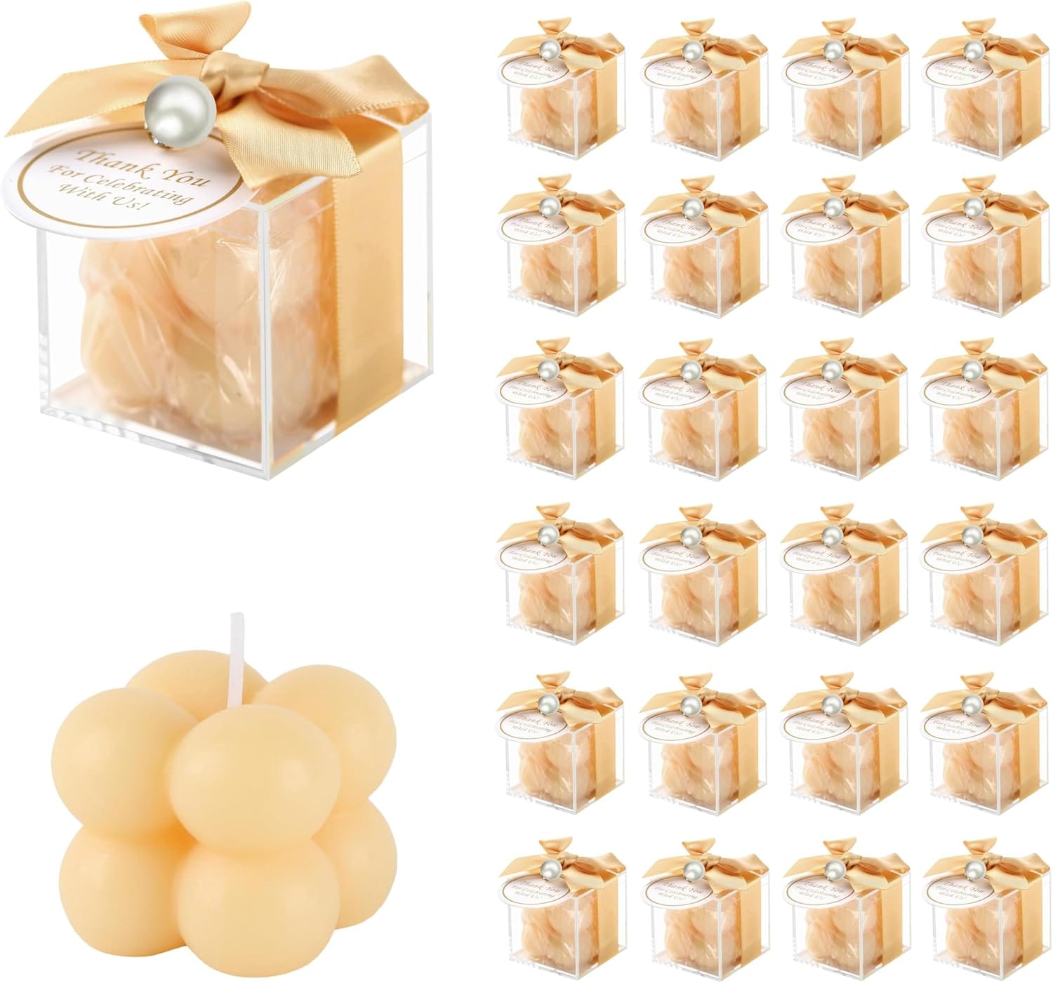 DIY favors like pearl-studded candles cut costs while adding a personal touch.