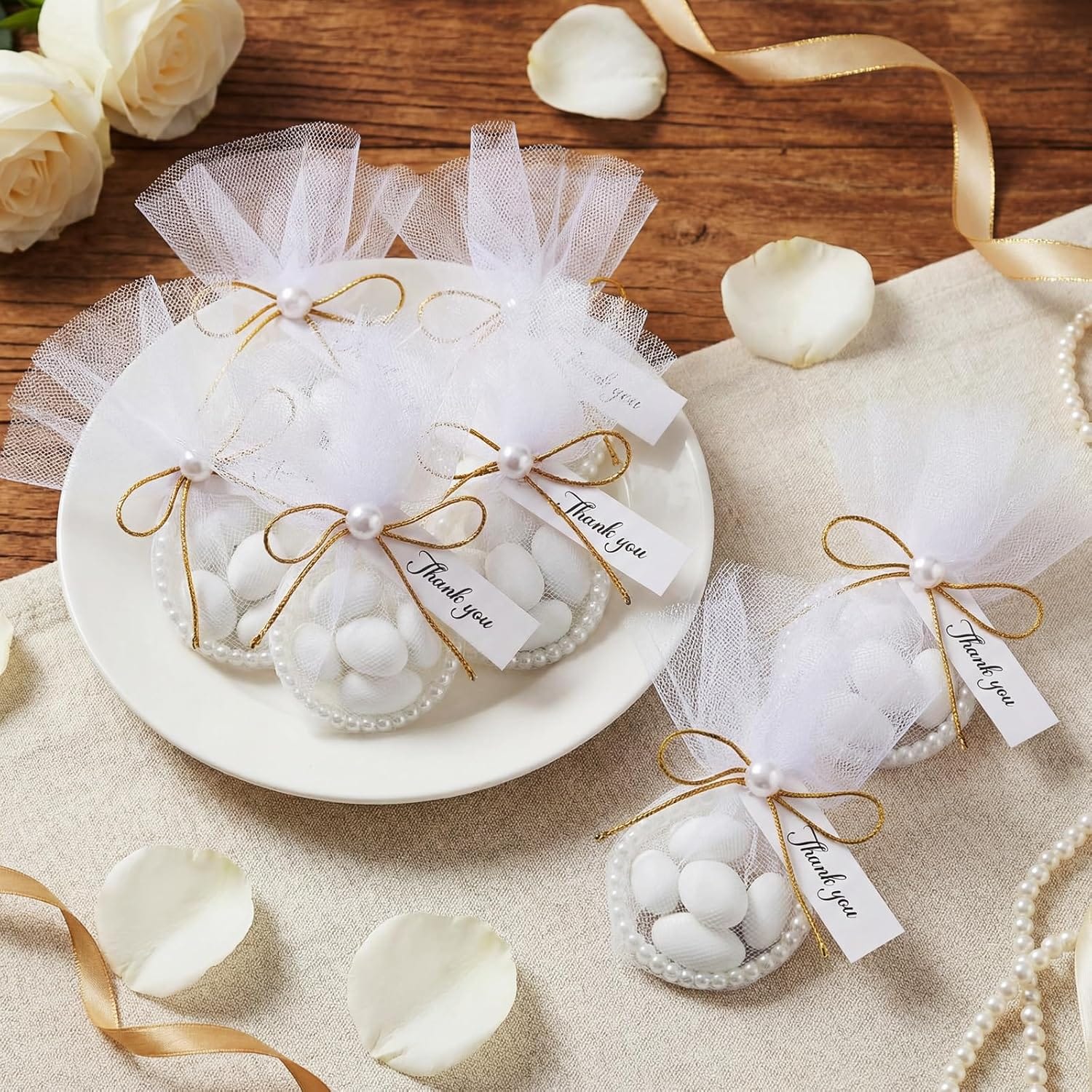 Favors are the final touch, and they should feel as thoughtful as the event itself. Mini bottles of prosecco wrapped in pearl-detailed ribbon are always a hit. You can also create pearl-themed soaps, candles, or bath bombs packaged in ivory boxes with gold calligraphy tags. For a sweet treat, fill organza bags with champagne-flavored gummies or chocolate truffles, tied with pearl-beaded strings.