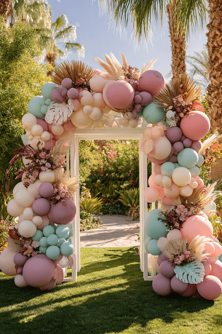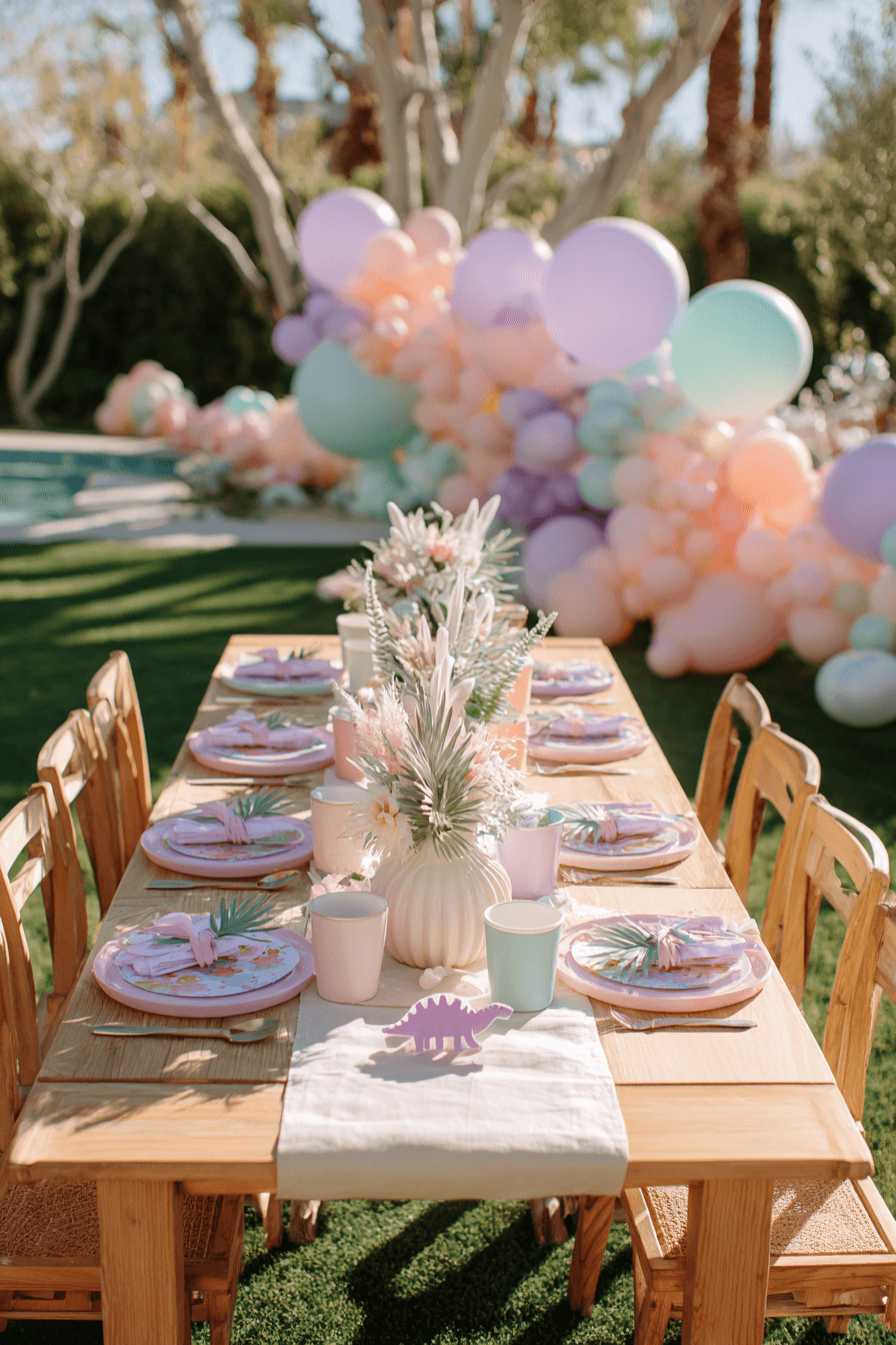 The pastel lavender, mint, peach, and blush balloon garland cloud behind the table on the lawn ties the guest area right into the main party decor beautifully — with a pool sparkling in the background and palm trees overhead, the whole scene feels like the perfect sunny afternoon birthday.