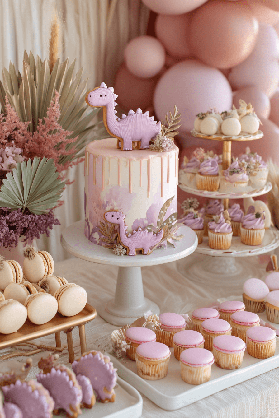 This dessert table is everything a One A-Saurus girl party calls for — soft, feminine, and absolutely loaded with the most beautiful treats. The hero is a single-tier blush pink drip cake with fondant dinosaur cookie toppers — one purple stegosaurus standing tall at the top and a smaller one on the side — with dried tropical leaf accents and delicate dried floral details. On tiered white stands and wooden serving boards all around it: lavender-piped cupcakes in two heights creating that layered dessert table look, rows of pink macaron discs lined up neatly on a flat tray, ivory macarons on a gold-handled stand, and more cupcakes with varied piping in blush and cream. A soft pink balloon garland floats above the whole display, and dried pampas and pink floral arrangements flank the back for that boho, garden-fresh atmosphere.