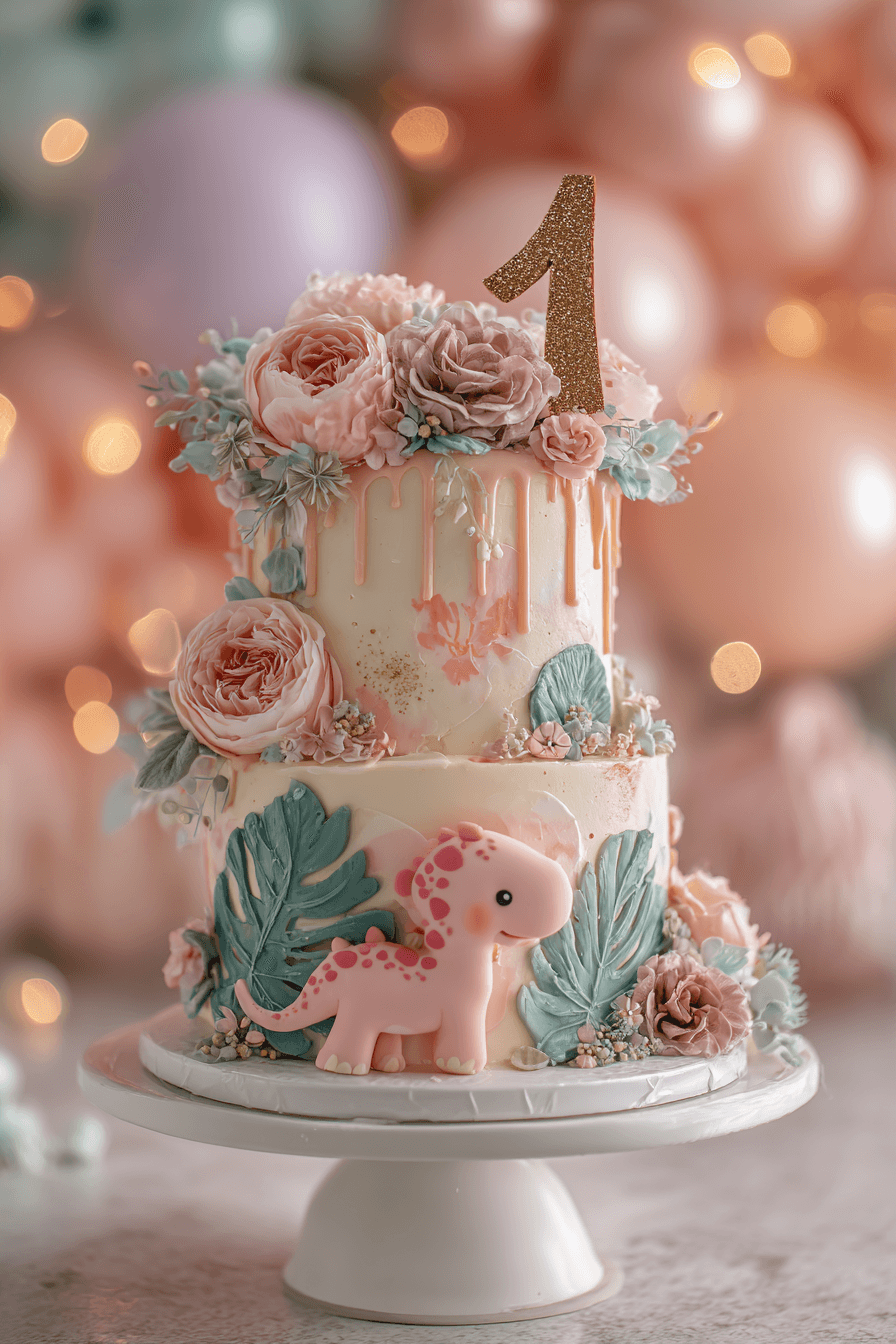 For a simpler DIY version, a single-tier blush buttercream cake with a pink drip, a store-bought fondant dino figurine, and a few fresh roses on top is genuinely all you need. This theme is so sweet that even the simplest version photographs beautifully.
