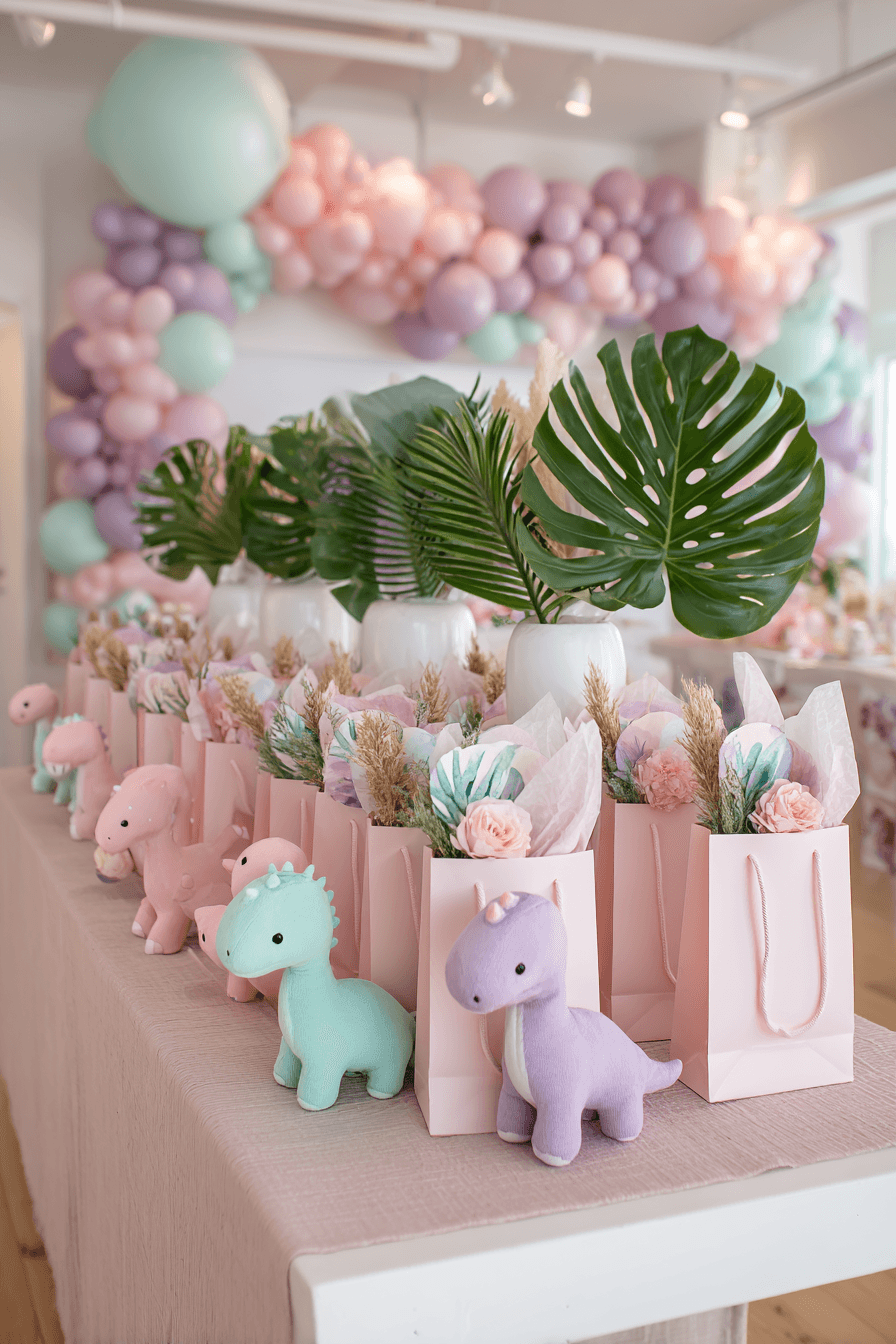 These One A-Saurus girl favor bags are genuinely some of the most heartwarming we have ever seen — and the plush dinosaur hero makes them completely irresistible. Blush pink gift bags with pink rope handles, each one overflowing with soft pink tissue paper and dried floral and pampas accents, lined up in a row on a blush linen table. In front of the bags: a parade of pastel plush dinosaur stuffies in mint green, lavender, and pink, each one the most adorable take-home keepsake a little guest could ask for. Oversized monstera leaves arranged in tall white vases create a lush green backdrop, and the mint, pink, and lavender balloon garland overhead ties the whole favor display into the party's main palette.